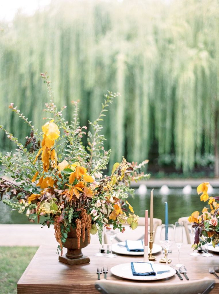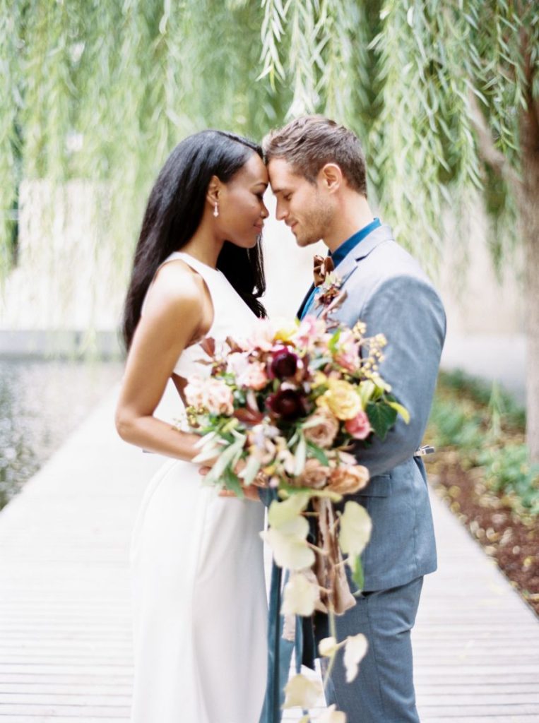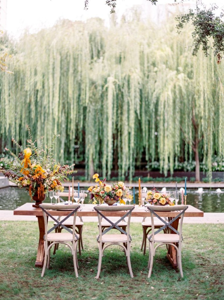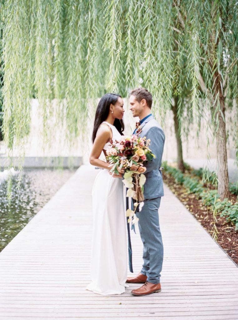 This contemporary art deco wedding inspiration in all its ethereal, weeping willow-shrouded paradise at Nasher Sculpture Center is just perfect for an intimate wedding celebration that you want to give a sweet, secluded feel! Bringing warm and cool tones together in this color palette rounds it out, and modern teal, blush and dove complement with autumnal shades of maroon, burnt orange and mustard. This bride looks so chic in a simple, high-neck gown from a&bé bridal shop that flatters her in every way possible, and doesn’t distract from the rest of her flawless bridal look! We love the organic-feeling tablescapes, all the mismatched candlesticks in coordinating colors, the stunning faux-marble cake, and the way these wedding scenes are set in front of scenic, draping weeping willows, lush green grass and a calming fountain pool. We’re obsessed with everything about this intimate and contemporary art deco wedding inspiration, all captured flawlessly by Dyan Elizabeth Photography! Keep scrolling to go through this gorgeous gallery and all the darling details in this styled shoot. Happy planning!