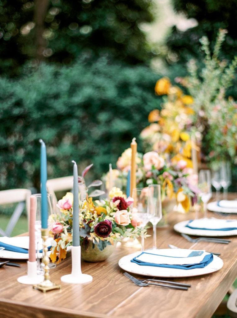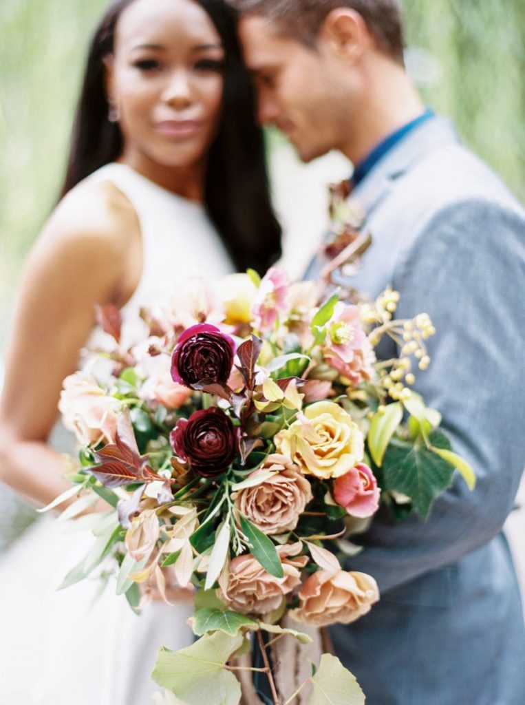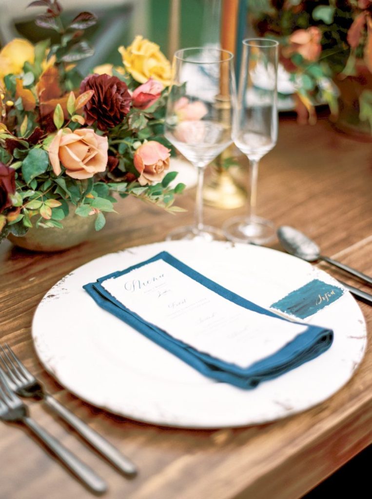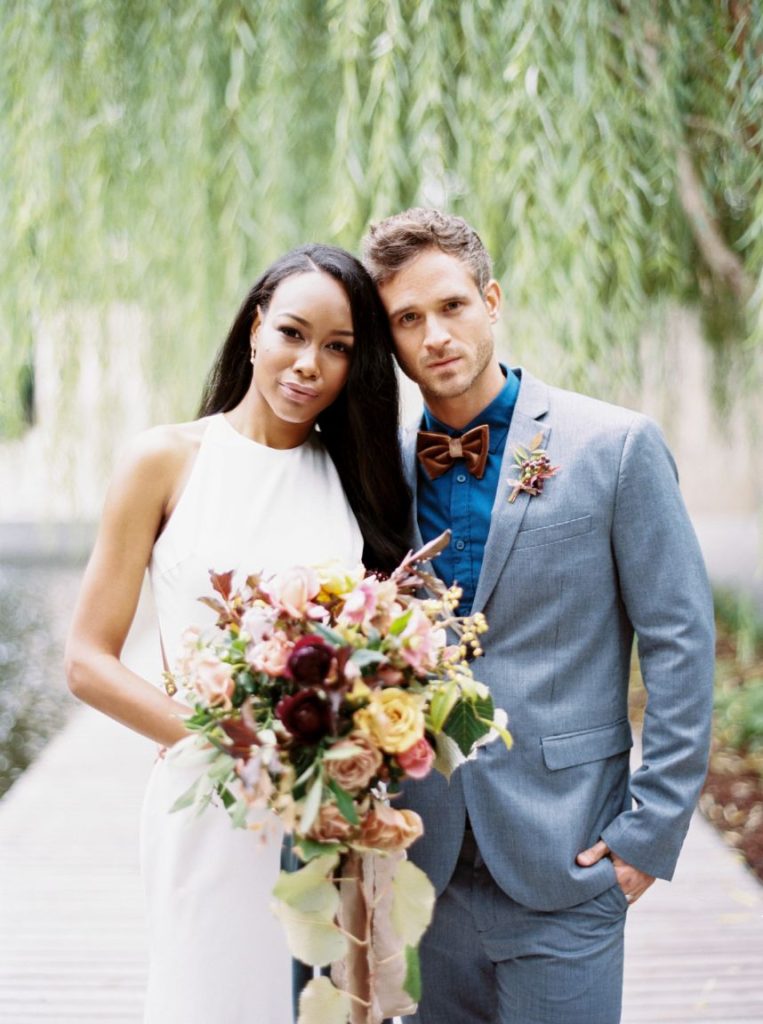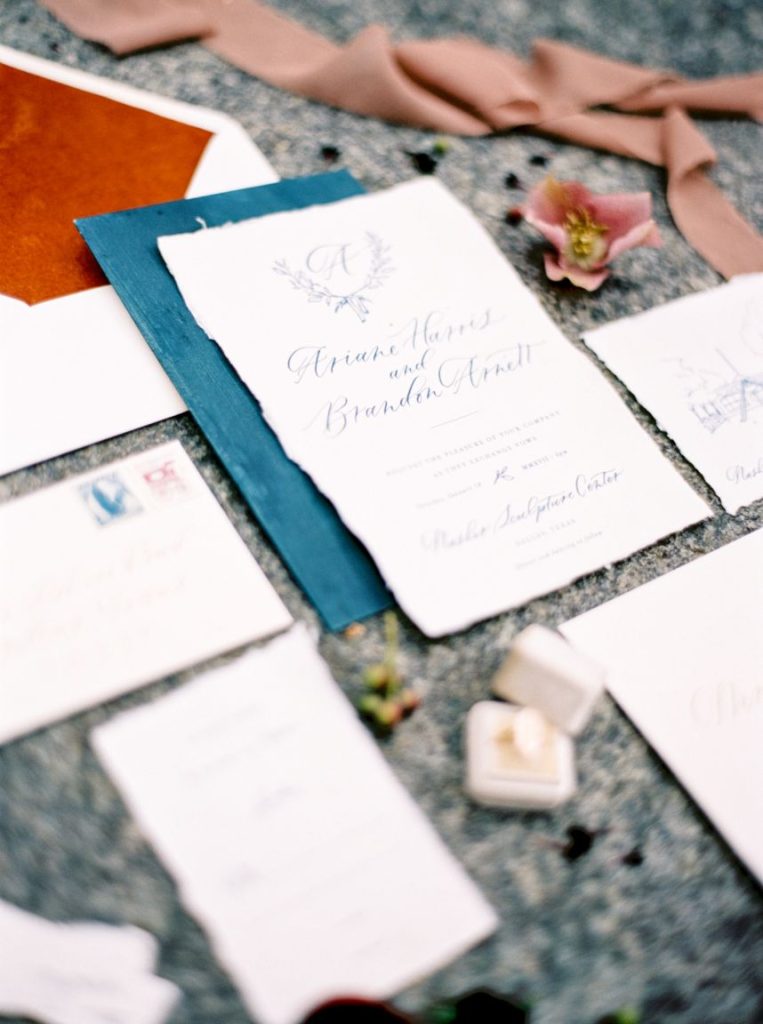 This contemporary art deco wedding inspiration in all its ethereal, weeping willow-shrouded paradise at Nasher Sculpture Center is just perfect for an intimate wedding celebration that you want to give a sweet, secluded feel! Bringing warm and cool tones together in this color palette rounds it out, and modern teal, blush and dove complement with autumnal shades of maroon, burnt orange and mustard. This bride looks so chic in a simple, high-neck gown from a&bé bridal shop that flatters her in every way possible, and doesn’t distract from the rest of her flawless bridal look! We love the organic-feeling tablescapes, all the mismatched candlesticks in coordinating colors, the stunning faux-marble cake, and the way these wedding scenes are set in front of scenic, draping weeping willows, lush green grass and a calming fountain pool. We’re obsessed with everything about this intimate and contemporary art deco wedding inspiration, all captured flawlessly by Dyan Elizabeth Photography! Keep scrolling to go through this gorgeous gallery and all the darling details in this styled shoot. Happy planning!