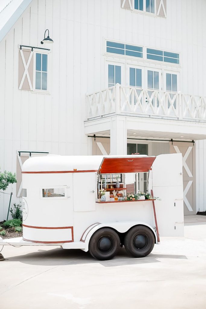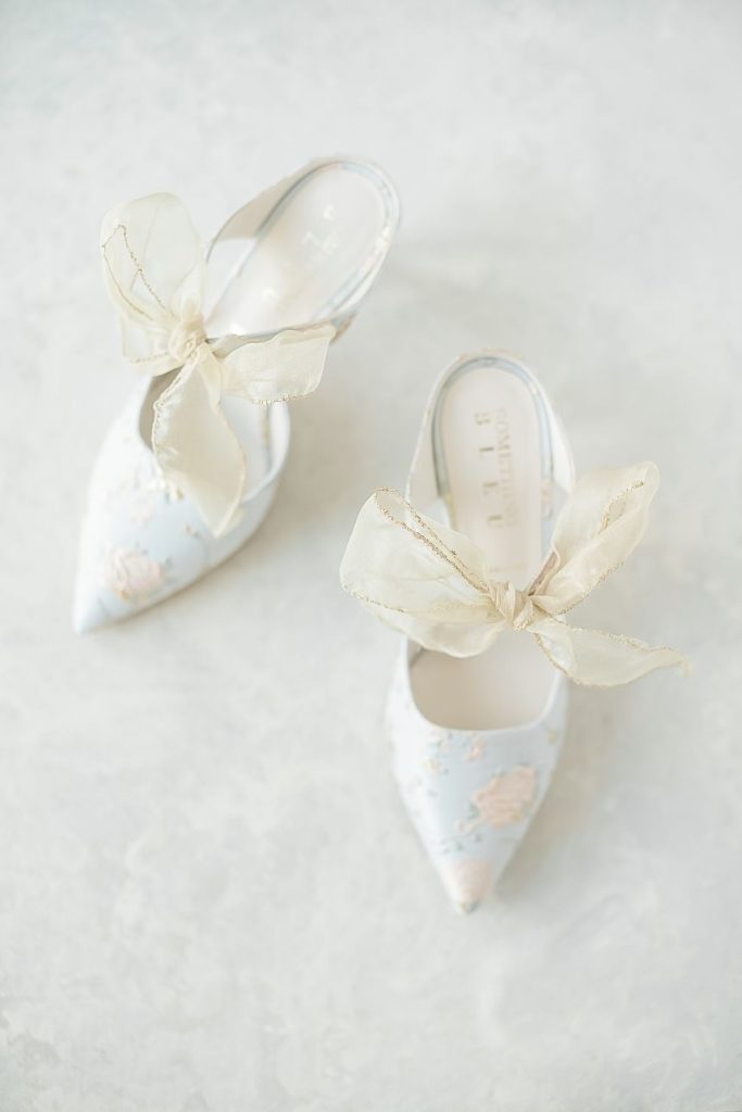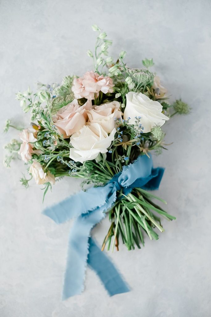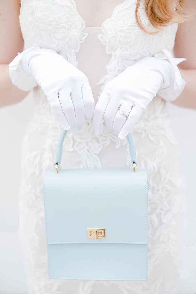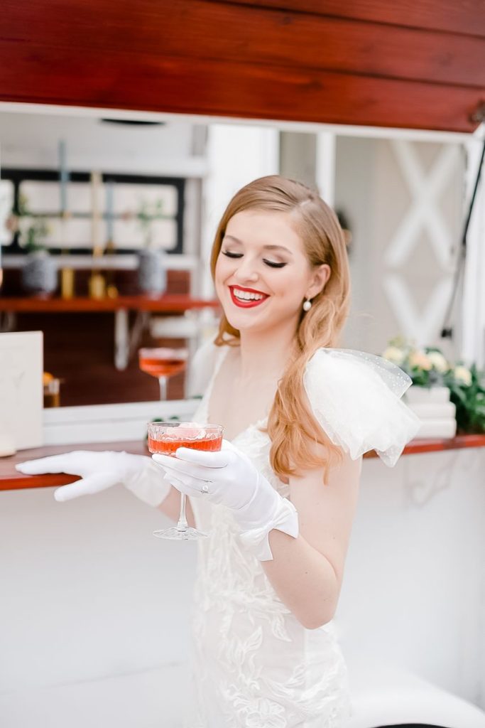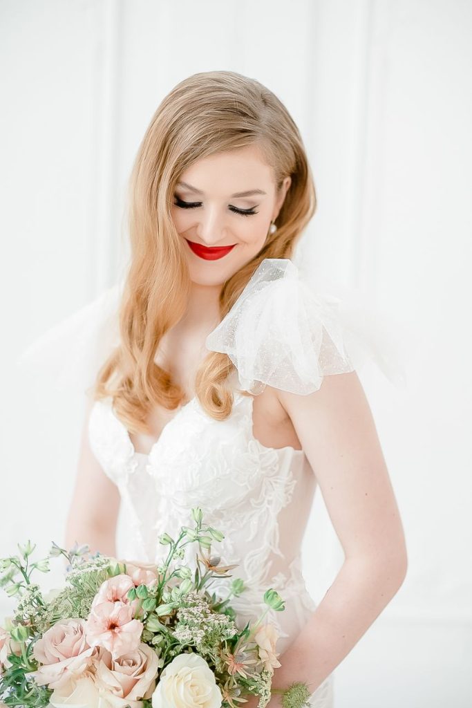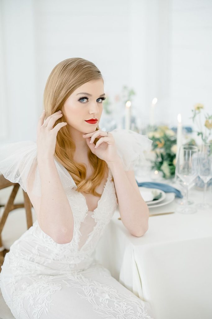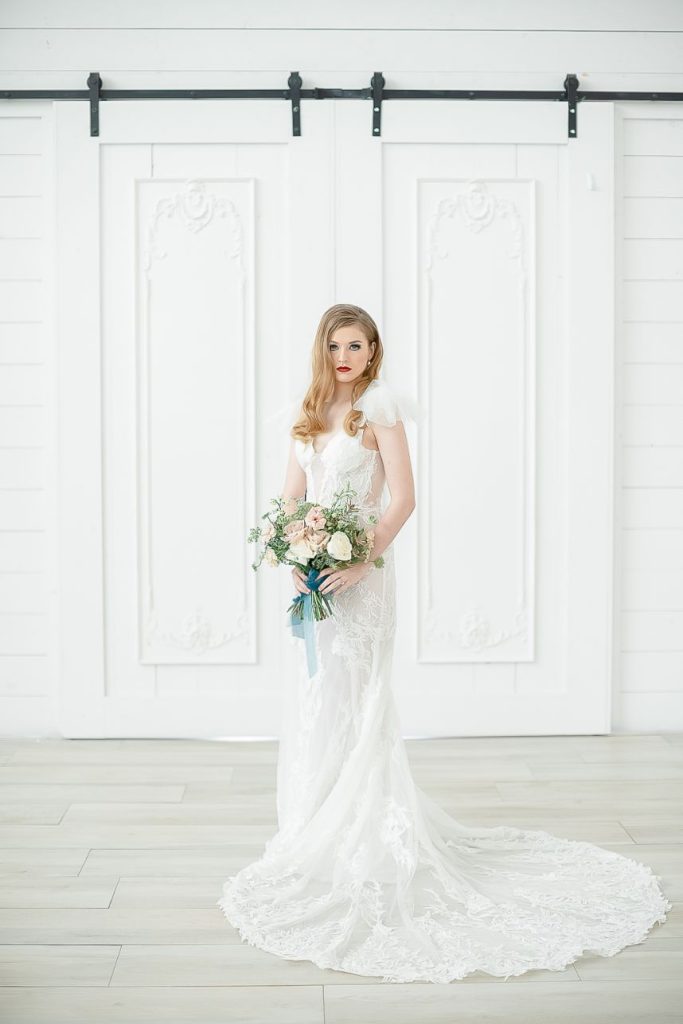 Inspired by the 365 letters he wrote to her, this 1940s style in sky blue hues is oh-so-fitting for a pair of love birds. An oh-so-abundant romance plays out before our very eyes at The Nest at Ruth Farms where the whole weddingscape had an air of magic about it that only love, and cinematic beginnings, can create. Cream, peach, and baby pink blooms from Kristen McCurdy Studio surround the scene with floral romance while our bride modeled the perfect vintage glam look styled by hair and makeup artists of Jennifer Trotter – Lip Service Makeup in full, southern belle curls and a classic red lip just like Allie would wear. Her classically beautiful lace wedding gown from LeAnn’s Bridal was a perfect choice and its ruffled shoulder details stole our hearts. Top it off with white bowed bridal gloves and embroidery-embellished heels for a look that is timelessly chic.