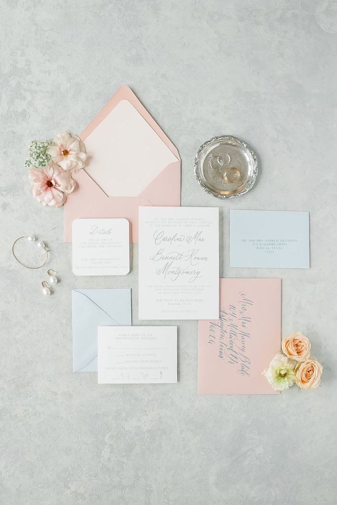From Alexandra with Ladybird Paper Co.: “This suite, menu, and bar sign are for a bride that likes soft, romantic colors, and clean lines. There is custom spot calligraphy and entree selection illustrations.”