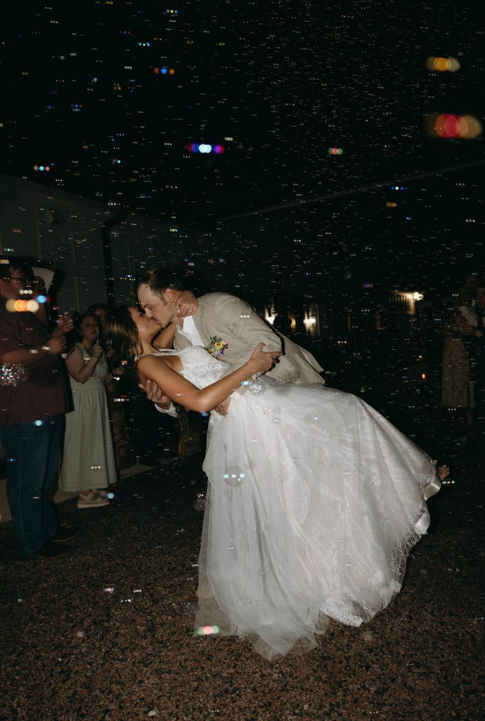 As the sun set and the night grew darker, the celebration didn’t lose its magic. The couple’s classic “just married” truck made for the most charming send-off, complete with dangling cans and shared smiles that said everything. Sitting together on the tailgate, they soaked in one last quiet moment before driving off into their new chapter.