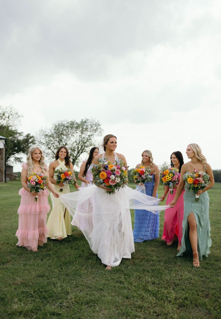 The day began with soft, natural light and a peaceful outdoor setting that set the tone for everything to come. The bride looked breathtaking in her lace gown, its delicate details catching the light beautifully as she walked. Surrounded by a stunning group of friends in bright, pastel dresses, the energy felt light, fun, and full of color. Their florals echoed the same vibrant palette, creating the dreamiest combination of spring tones and fresh blooms.