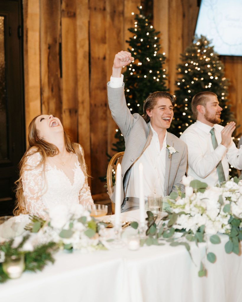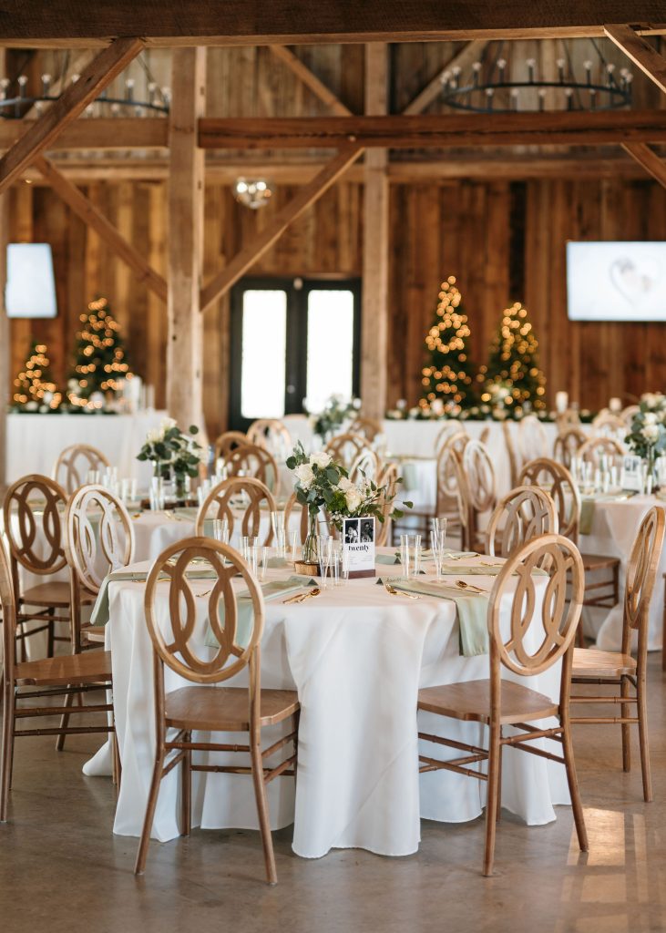Inside the reception space, guests were welcomed into a room glowing with charm. Soft, twinkling lights and small, beautifully decorated trees added a warm, seasonal touch. Elegant wooden chairs and tables dressed in crisp linens, gold accents, and soft greenery created a timeless look that felt both inviting and refined. Each centerpiece was thoughtfully arranged, complementing the natural textures of the space without overpowering it.