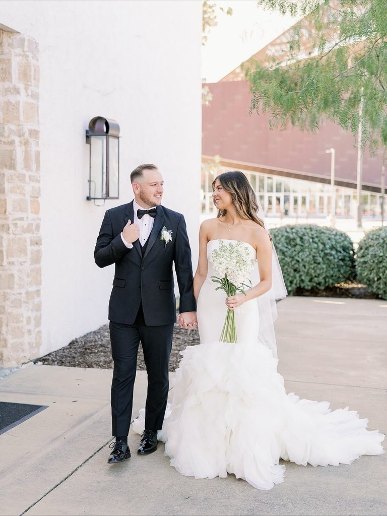 Weston and Elaina’s wedding at Texican Court brought chic Southwestern charm to life with thoughtful details and effortlessly modern design. Their courtyard ceremony, framed by clean white florals and the venue’s iconic brick fireplace, set the tone for a celebration that felt both intimate and elevated. Elaina stunned in a strapless gown with a ruffled skirt, perfectly complementing the bold, colorful bridesmaid palette and confetti-filled recessional. Guests were greeted with a “Fortunate for You All” escort wall, personalized matchboxes, and a candlelit dinner that blended warmth with contemporary elegance. Every moment highlighted their unique style, creating a truly memorable Texas wedding with personality and heart.
