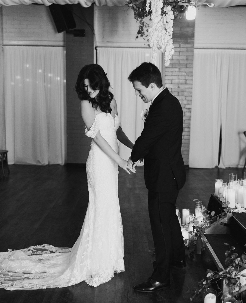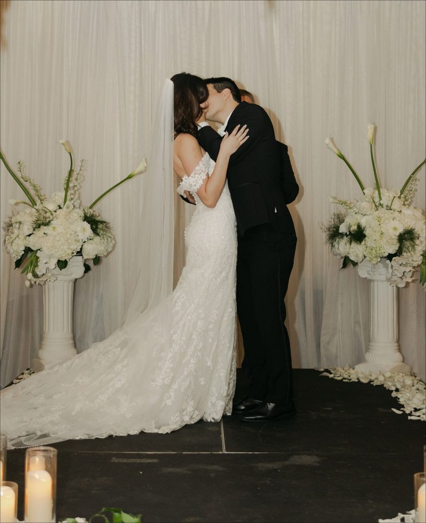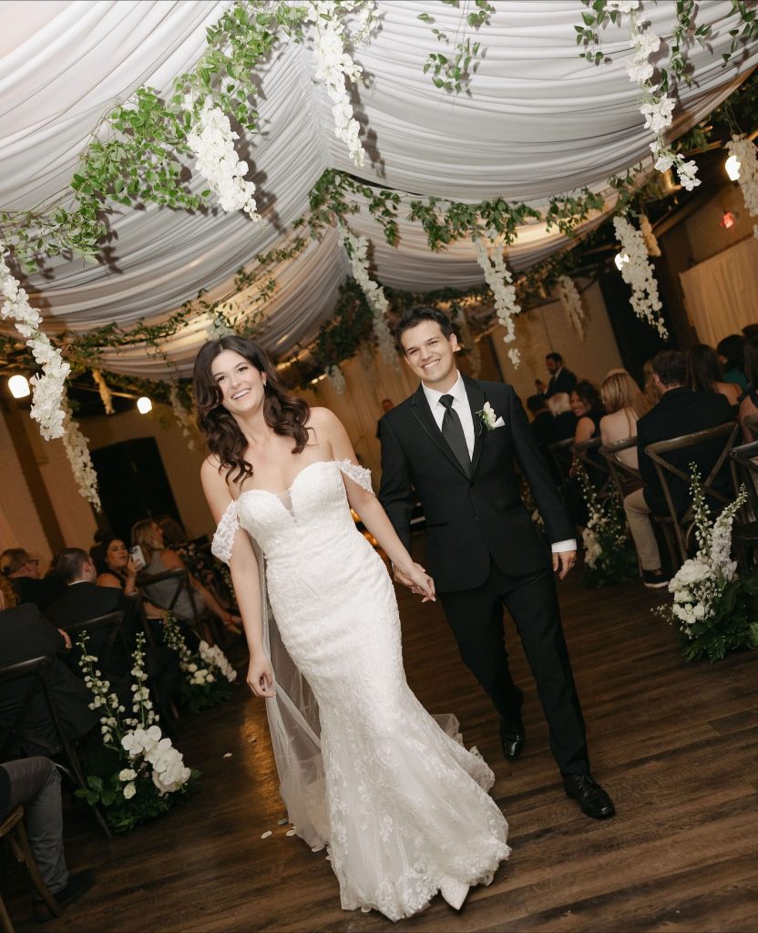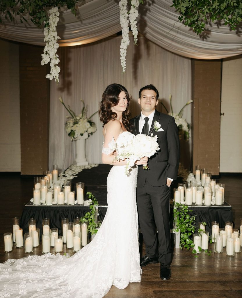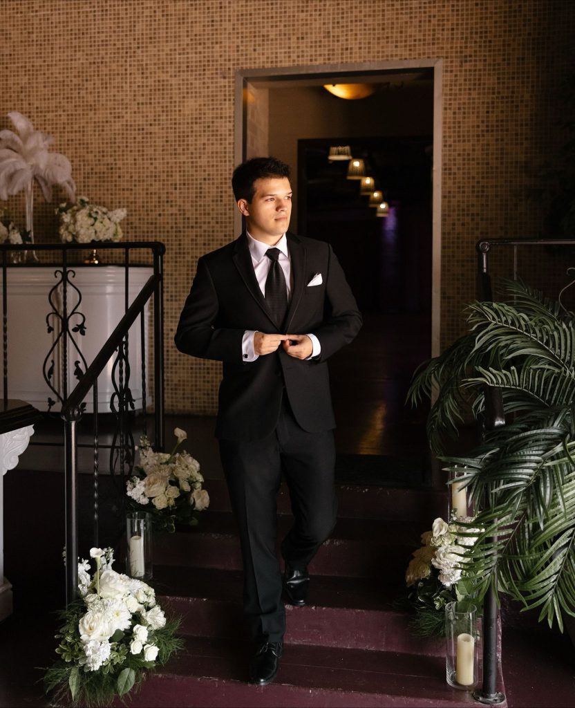This stunning Gatsby-inspired wedding brought the glamour of the Roaring 20s to life. With black and gold details, feather centerpieces, and romantic candlelight, the celebration exuded vintage sophistication and timeless allure. From the couple’s elegant attire to their classic getaway, every detail shimmered with old Hollywood charm and modern-day romance.