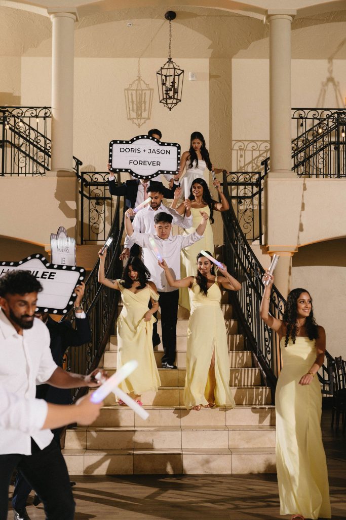 The celebration shifted from serene romance to high energy as the wedding party made their unforgettable entrance. Friends and family filled the staircase with laughter, movement, and glowing light sticks, turning a simple grand entrance into a full celebration. Guests held up marquee style signs with the couple’s names, cheering and setting the tone for a night filled with joy. The bright yellow bridesmaid dresses added a fresh and cheerful touch, bringing vibrancy to every frame.
