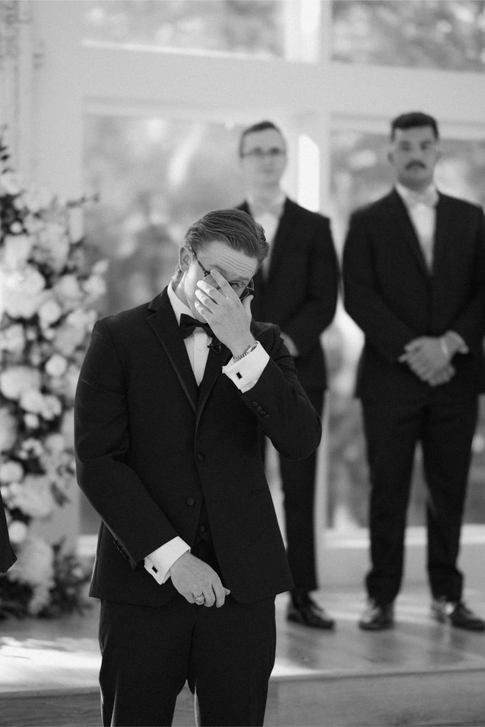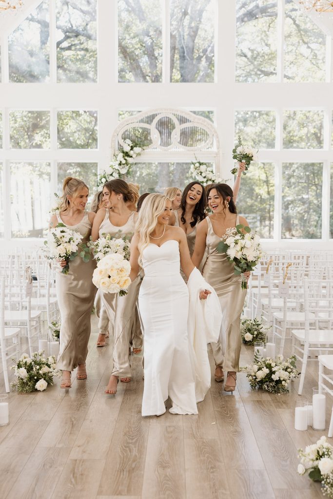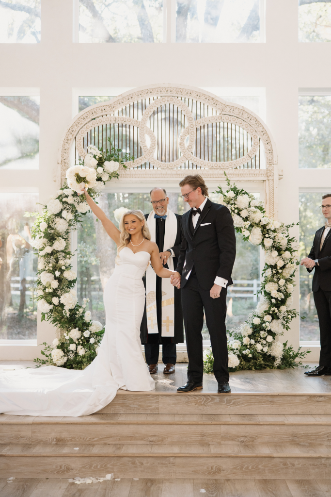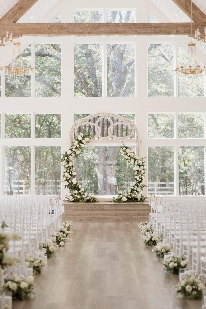 The ceremony took place in a chapel that felt like a dream. Sunlight poured through the tall windows, illuminating soft white florals that framed the altar in the most romantic way. The setting was serene and graceful, with every detail from the floral lined aisle to the natural wood beams creating an atmosphere of warmth and love.