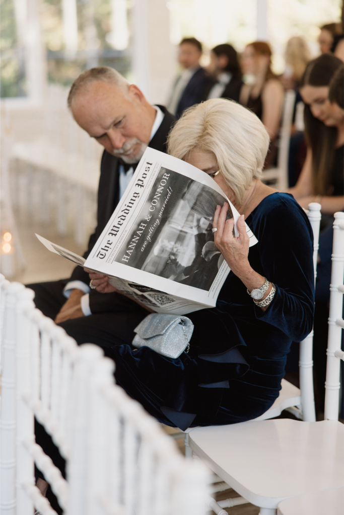 Guests were welcomed with personalized touches that made the celebration feel intimate and unique. One of the most delightful surprises was the custom wedding newspaper announcing “Hannah and Connor are getting married!” which brought smiles to everyone as they took their seats.