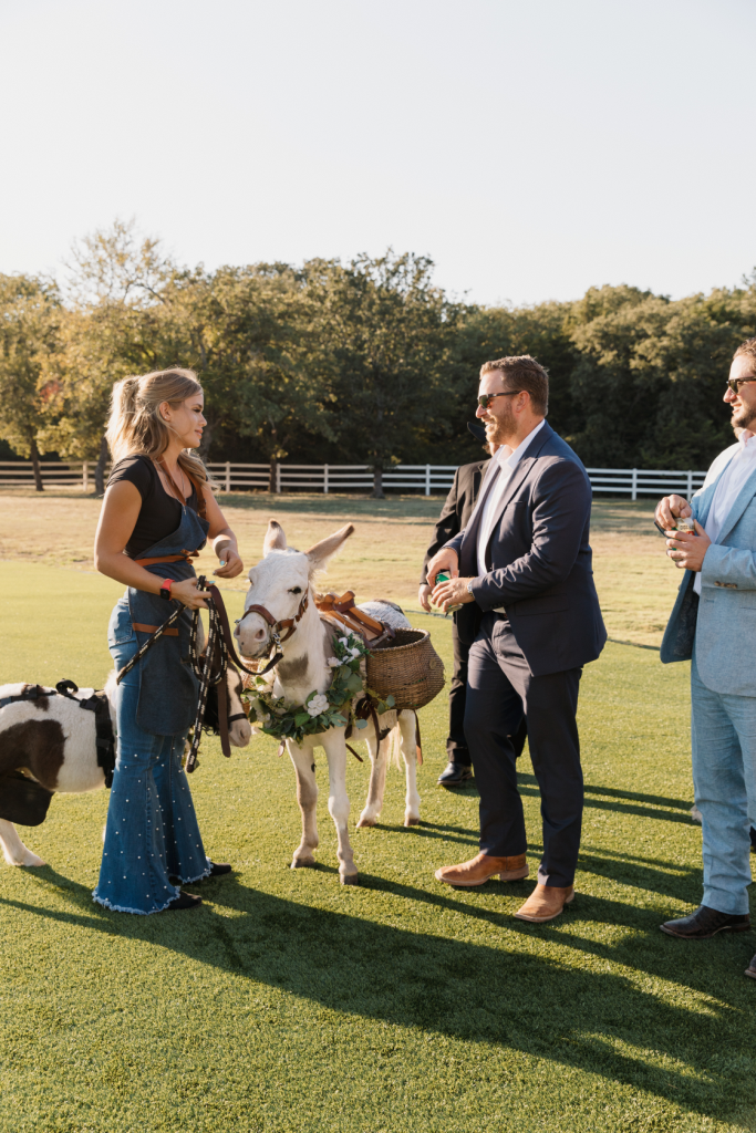 The celebration continued outdoors where guests were greeted with signature drinks served in the most charming way, by miniature donkeys adorned with flower garlands. It was a moment that captured the couple’s playful spirit and had everyone talking.