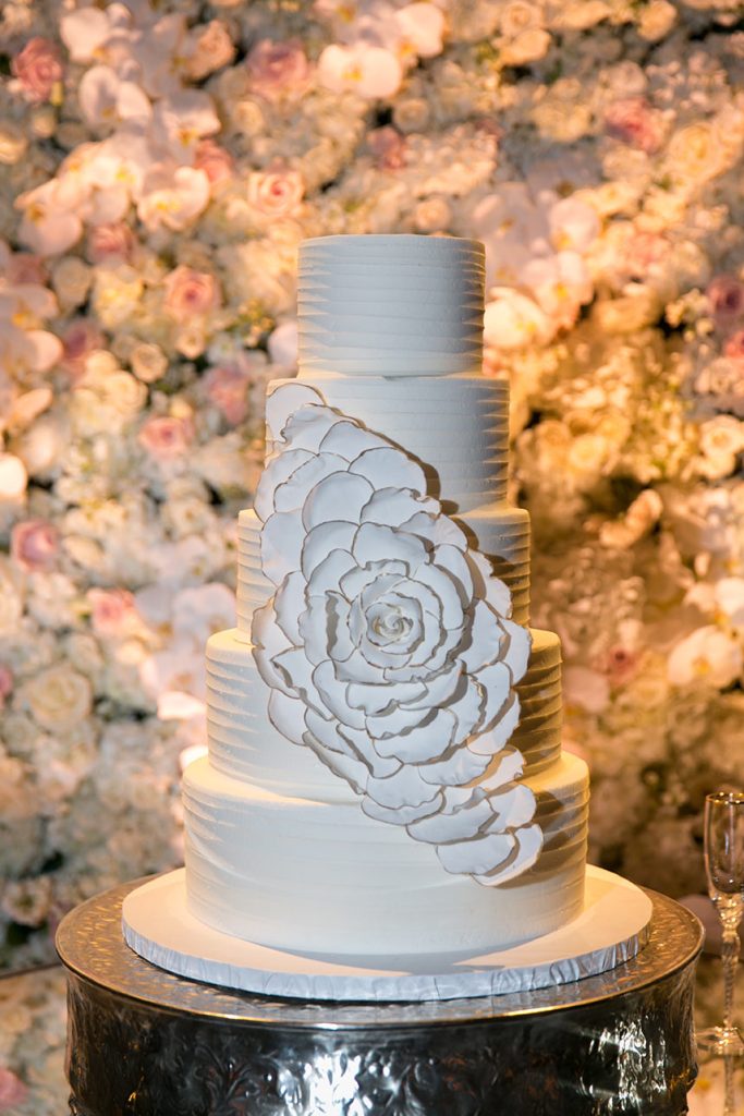 SAVORY SWEETS: Amanda and John wanted a simple cake because of the large and detailed flower wall staged behind it. The white frosted cake had a large flower cascading down the edges, tipped in gold. It featured two flavors, almond and raspberry filling with plain white cake.