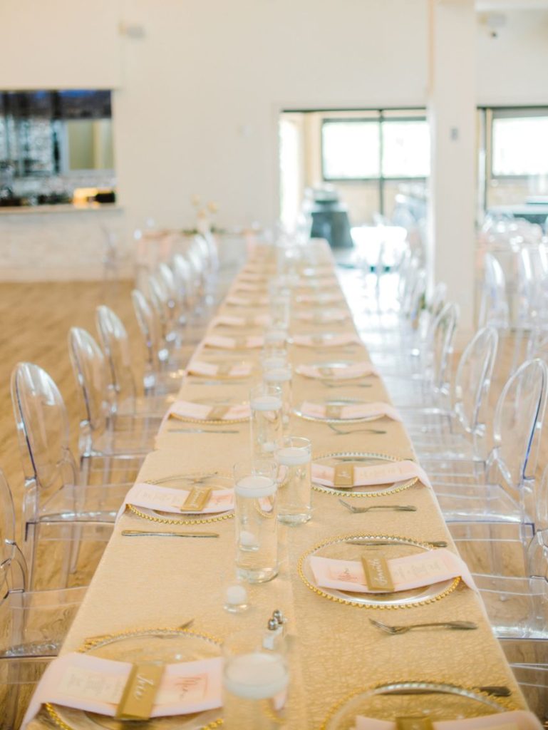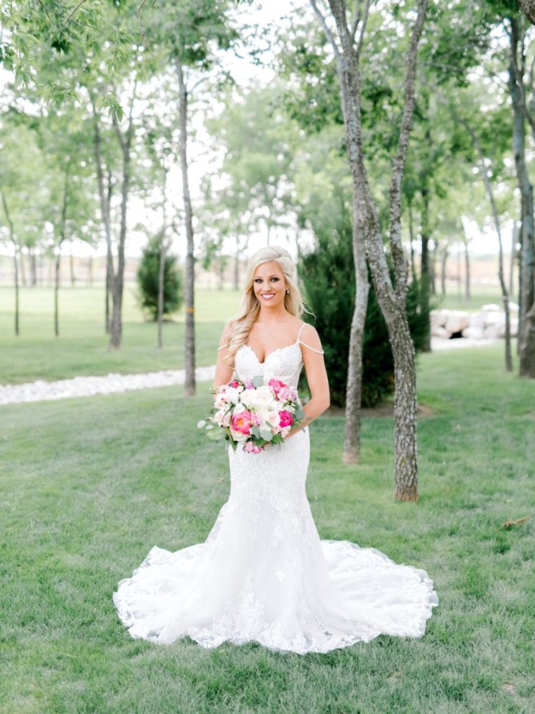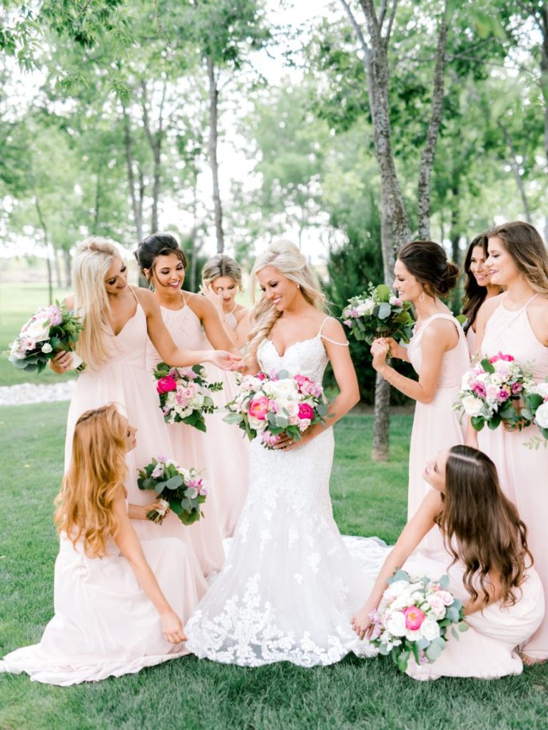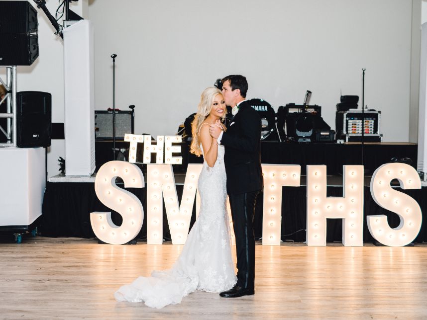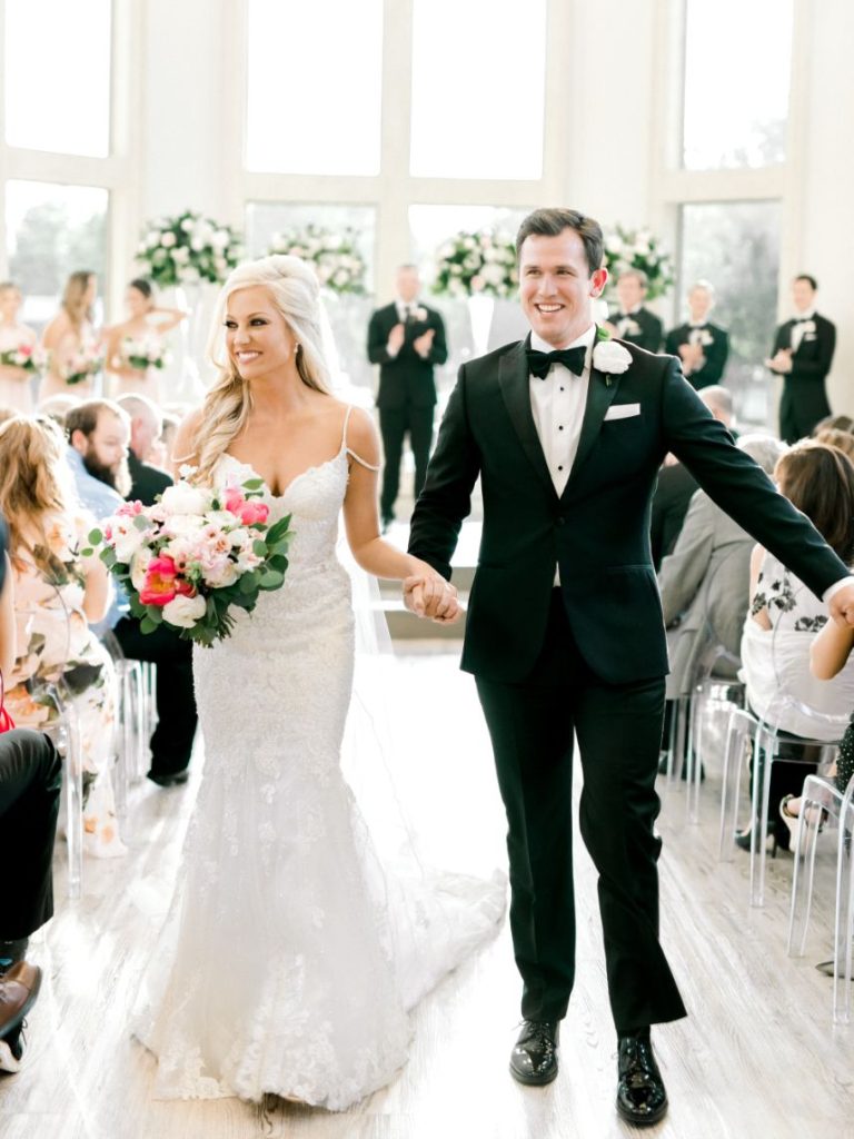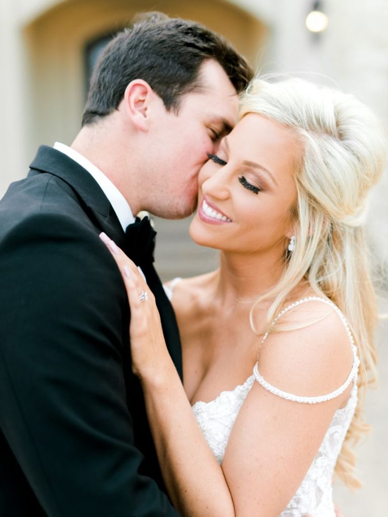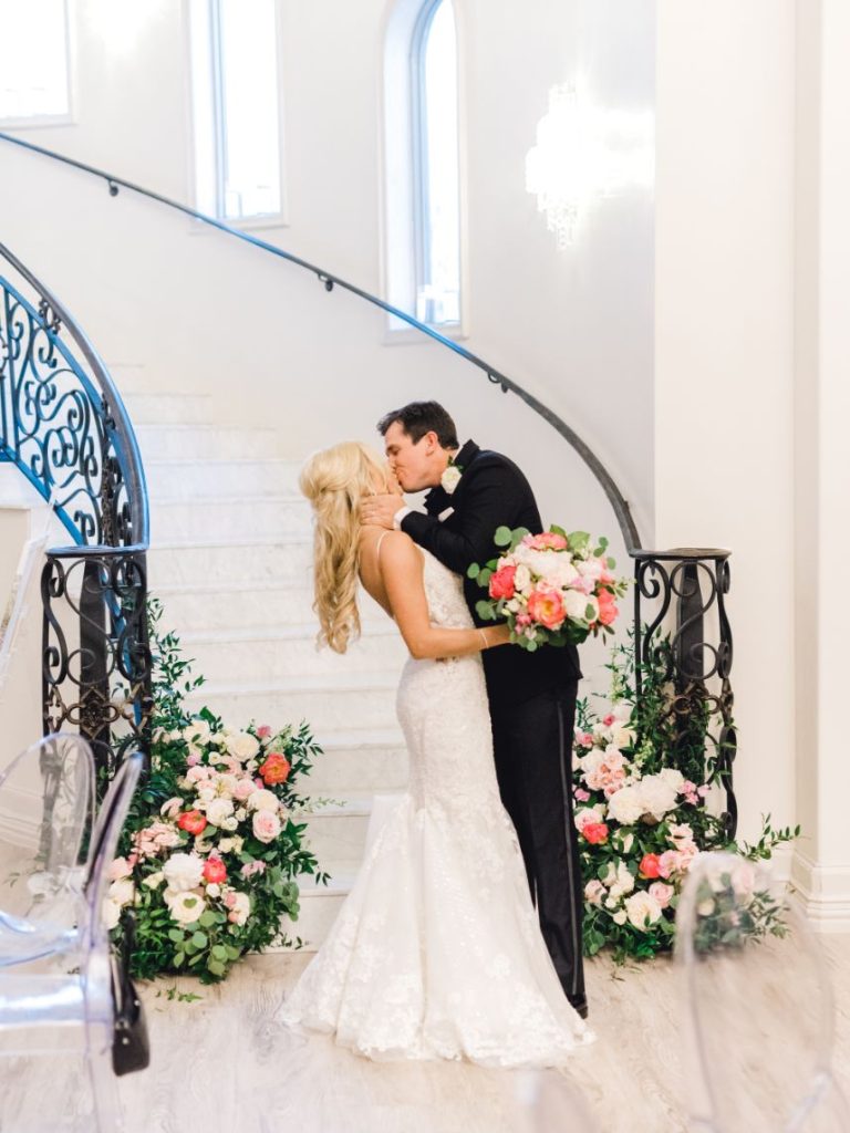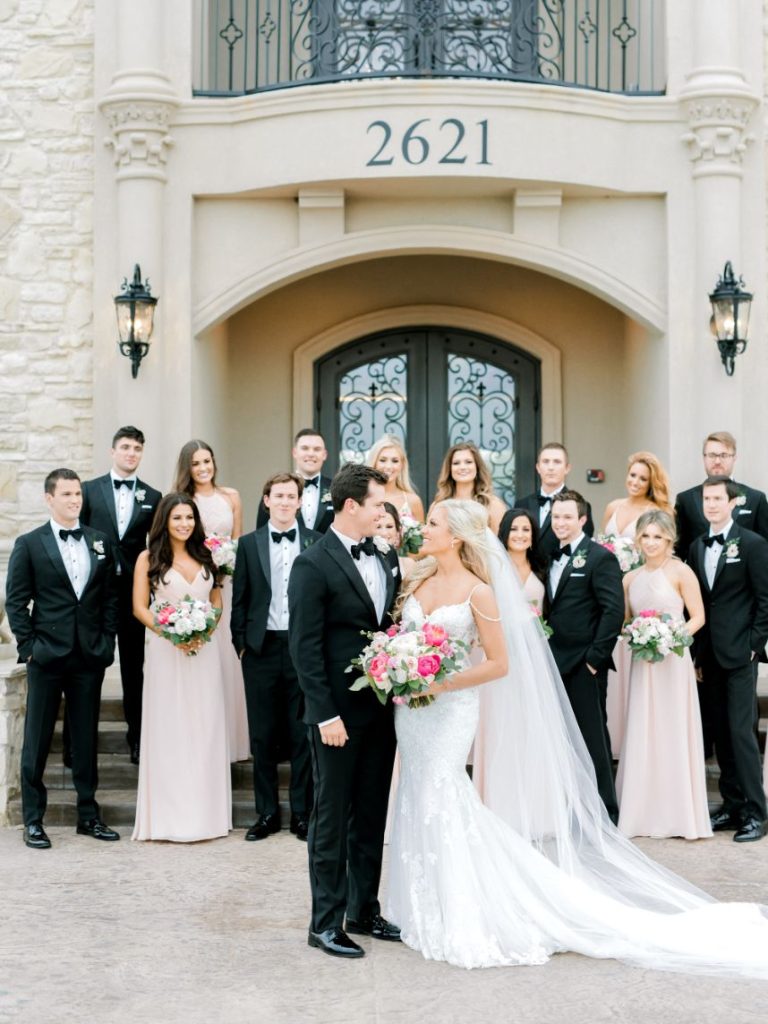 We can’t get enough of Lexie and Grant’s beautifully blush wedding or its romantic elements! Lexie looks absolutely stunning in her mermaid gown from Bridal Boutique with the most elegant beaded cold-shoulder sleeves, and her bridesmaids all look gorgeous in their coordinating blush gowns in various styles from Beside the Bride. Every member of this bridal party has been perfectly primped with updos, tousled locks and glowing makeup artistry by The Styling Stewardess. Tablescapes perfectly designed with big blooms in mind from Something Pretty Floral add so much romance and life to the scene, and we love the floral installation draped over the staircase banisters. Our favorite part about this big day was the couple’s choice of illuminated marquee letters to show off their new last name from Alpha Lit Letters – bringing their wedding day to a whole new level! Read on to hear this Dallas Cowboy Cheerleader bride’s favorite memory from the wedding reception. Cheers to Lexie and Grant!