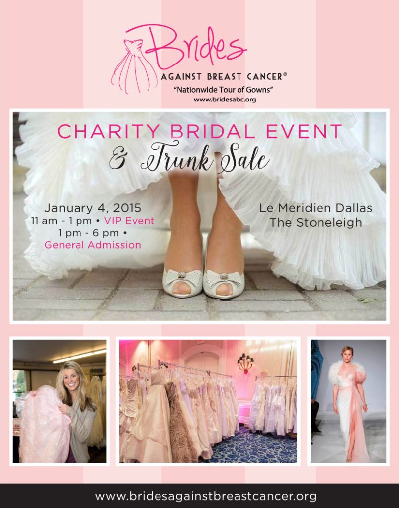 This is one event you won’t want to miss! Make plans to attend Brides Against Breast Cancer – a national non-profit traveling bridal show. These pop up bridal trunk show events happen in 150 cities a year, and they’re coming to Dallas on Sunday, January 4, 2015, from 1pm – 6pm at Le Meridien Dallas The Stoneleigh. Be the first to try on and purchase your gown before general admission during the VIP event from 11am – 1pm. With 500 to 1100 designer couture wedding gowns, you’re sure to find your dream gown and benefit an amazing cause at the same time! If you’d love to support but have already said I do, you can actually donate your wedding gown to Brides Against Breast Cancer! Come mingle with fabulous wedding vendors and enjoy light bites, signature beverages and great giveaways. Click here for more details and to purchase your tickets. We’ll see you there!