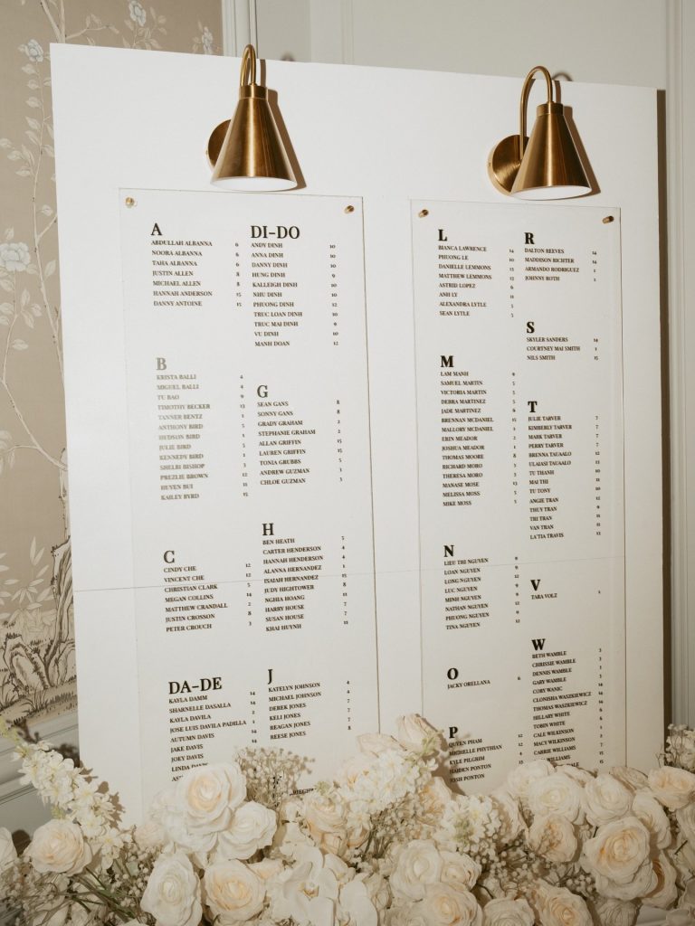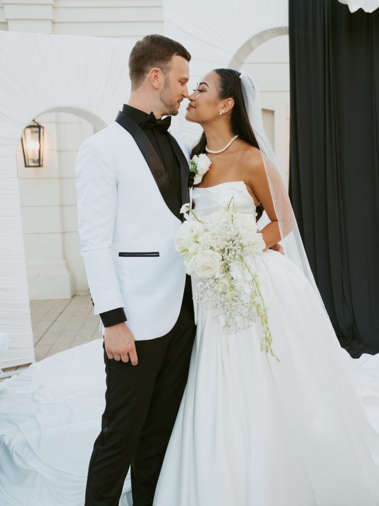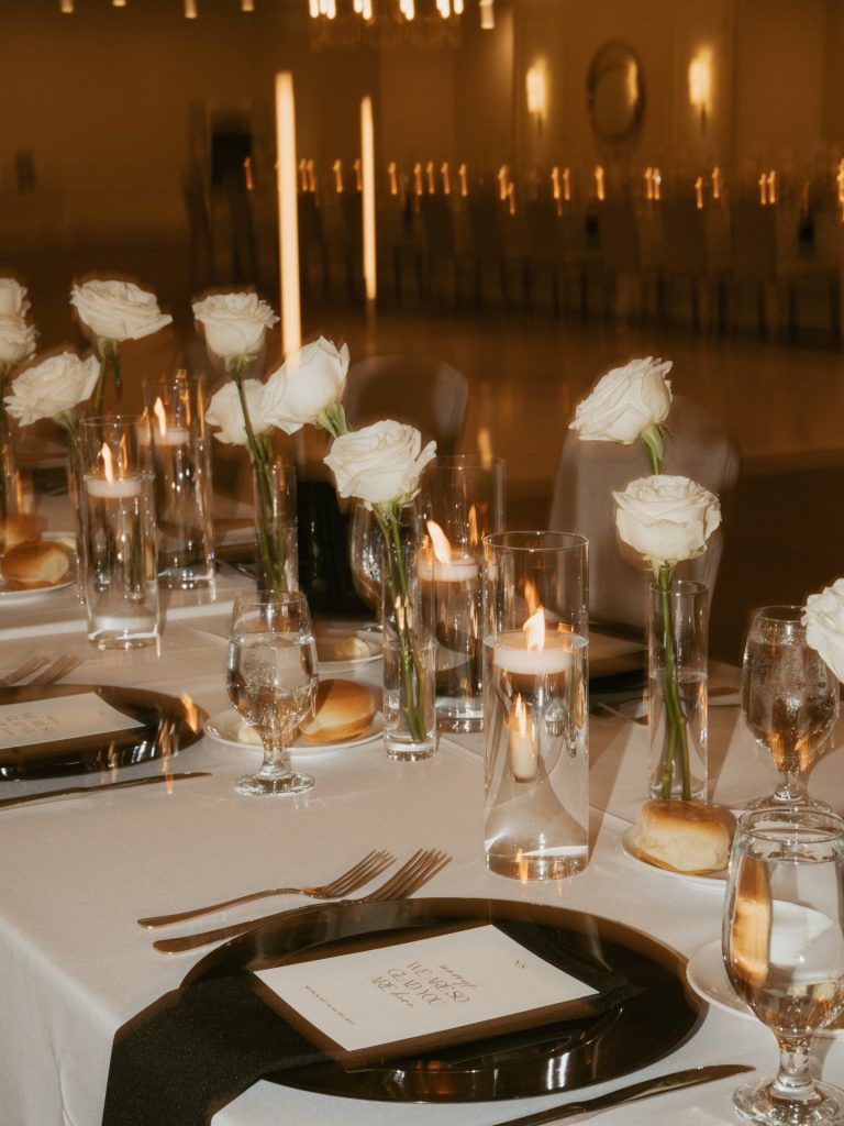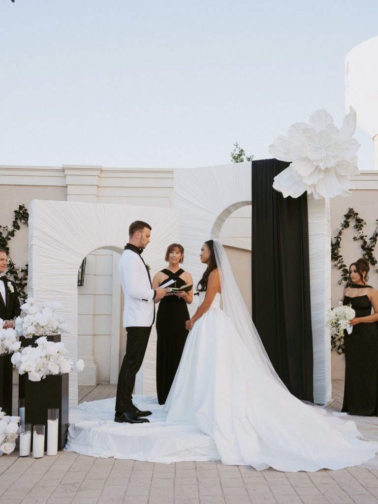 This stunning black and white wedding blended modern sophistication with timeless romance, creating a celebration full of elevated details and unforgettable moments. From the candlelit reception with glowing gold accents to the lush white floral installations lining the ceremony aisle, every element felt intentional and refined. Nikki stunned in a sleek, fashion-forward gown while she and Steven shared both joyful and intimate moments, from a grand cake cutting to a packed dance floor celebration. Thoughtfully designed details like a chic seating chart display and classic tablescapes tied the entire day together. This elegant wedding is the perfect inspiration for couples dreaming of a clean, modern aesthetic with a touch of luxury.