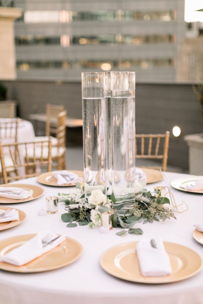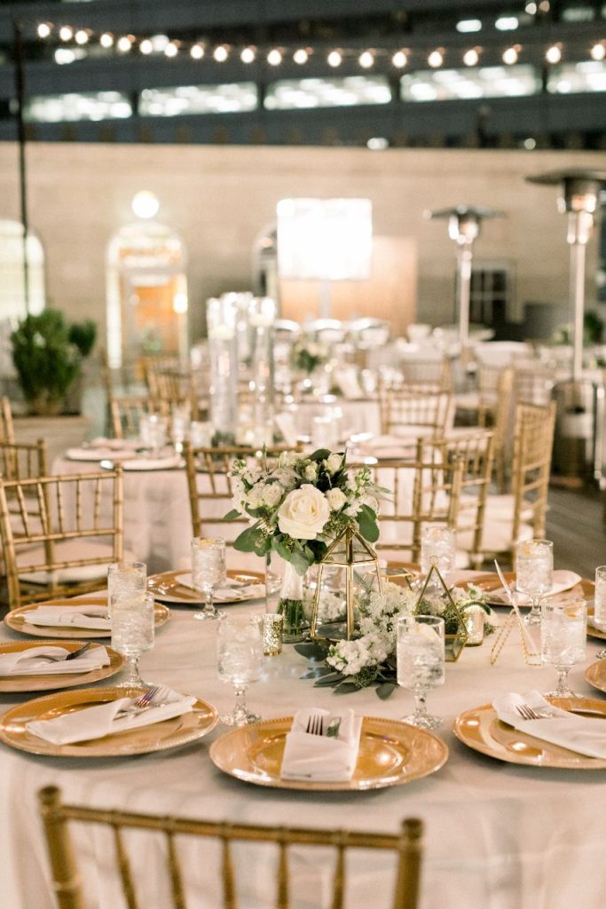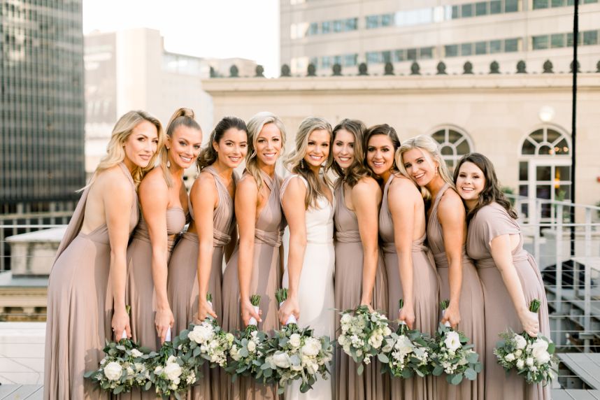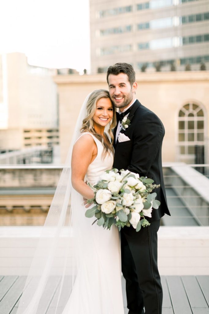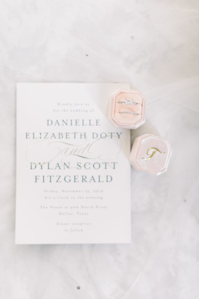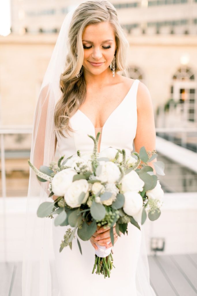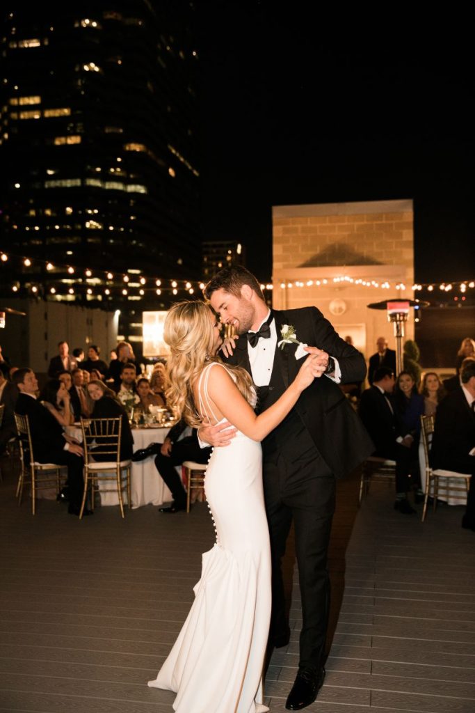 This classic and simple wedding showcased some of the most beautiful details in shades of ivory and gold! Danielle and Dylan look effortlessly stunning in this picturesque gallery of their wedding day, and we love how perfect every picture looks! Every scene at The Venue at 400 North Ervay is filled with fresh ivory blooms, accented with ropes of greenery and gold touches. Danielle looks like she is straight out of a bridal magazine in her classic satin gown with a plunging neckline from the Bridal Boutique, alongside her girl gang in earth tone dresses from Lulu’s Bridal, all styled differently to showcase their individual styles. Tablescapes lined with aromatic greenery, gold geometric candles and blooming floral centerpieces make us want to join in on the festivities! The couple opted for a rooftop reception in the evening and LeForce Entertainment made sure the night was perfectly lit for capturing photos and dancing the night away! Read on to hear from the bride about her favorite wedding memory. Cheers to Danielle and Dylan!
