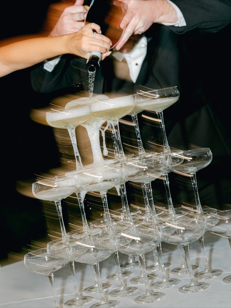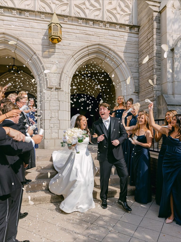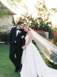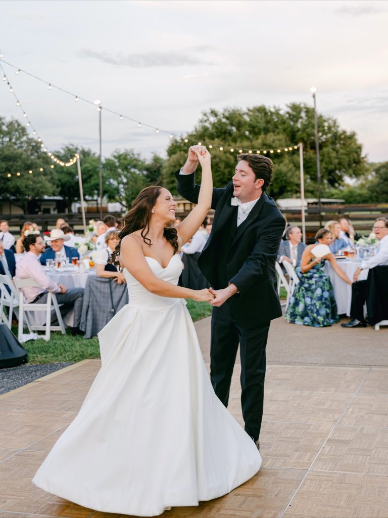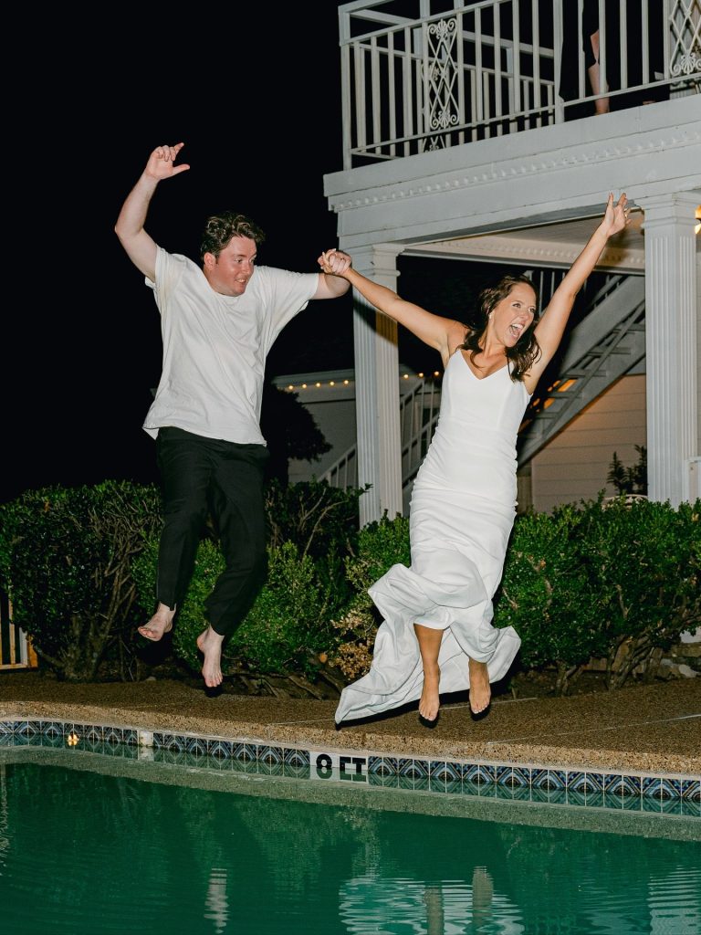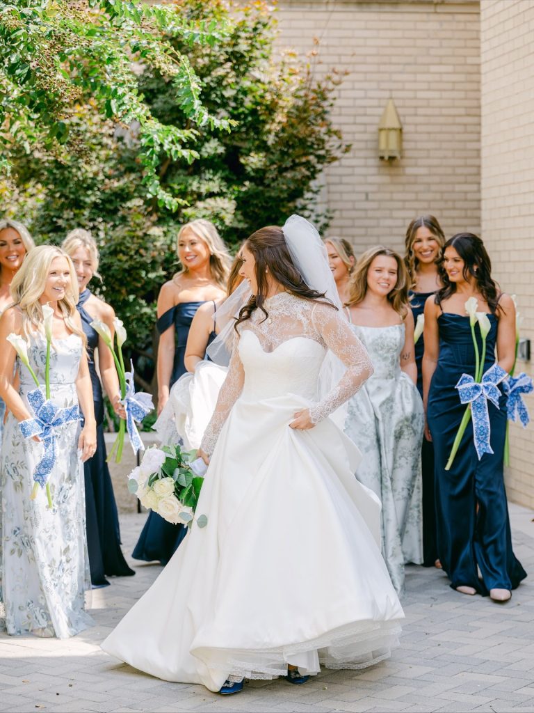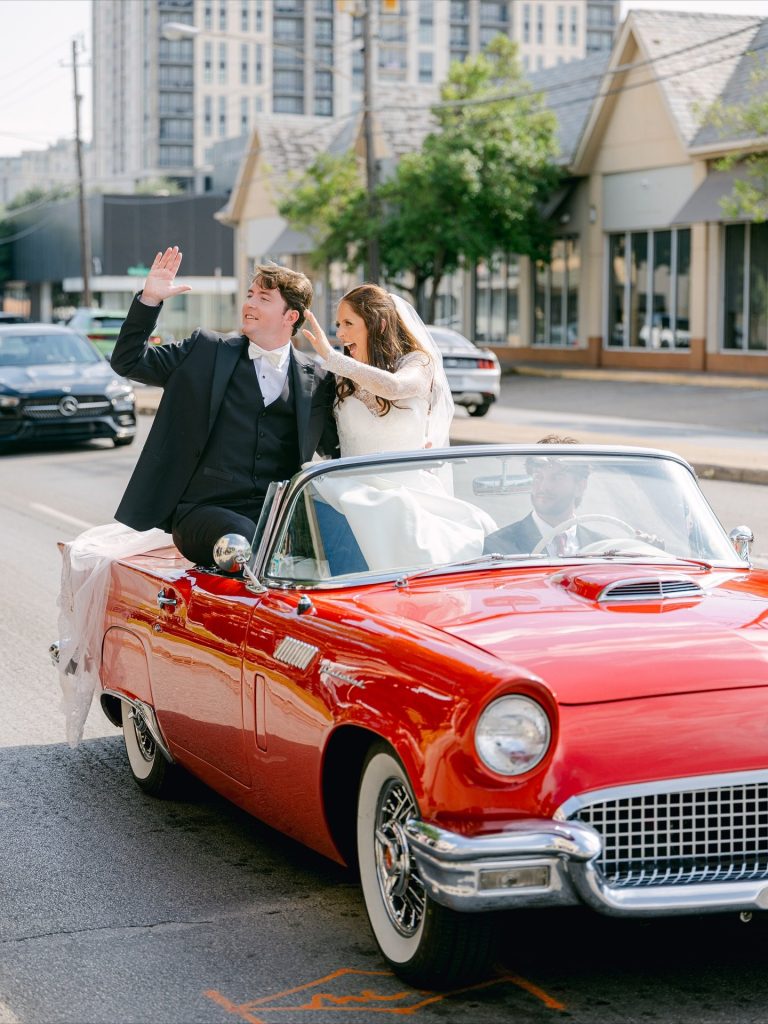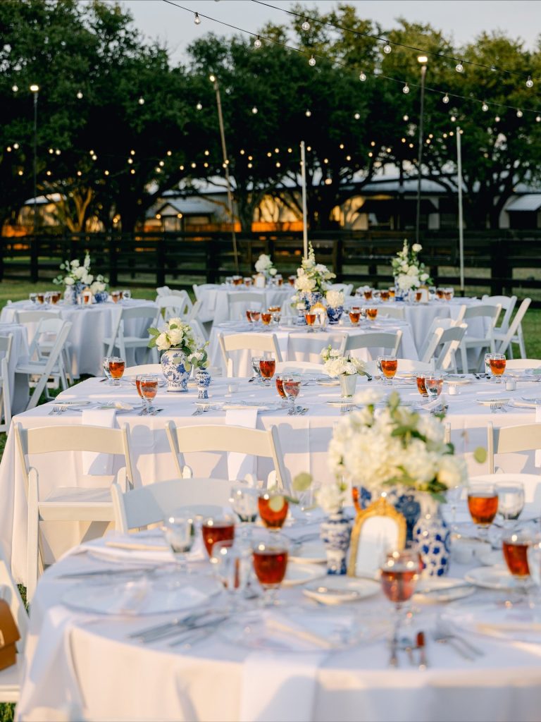 This timeless celebration blended classic elegance with personal flair, from the bride’s lace-sleeved gown and cobalt Manolos to bridesmaids carrying calla lilies tied in blue patterned ribbons. After a beautiful church ceremony and joyful petal toss, the couple rode off in a vintage red convertible before hosting an al-fresco reception at Southfork Ranch adorned with chinoiserie vases, crisp white linens, and twinkling lights. The night ended with the most unforgettable splash — a newlywed pool jump that perfectly captured their playful spirit. A stunning marriage of tradition, personality, and pure joy.