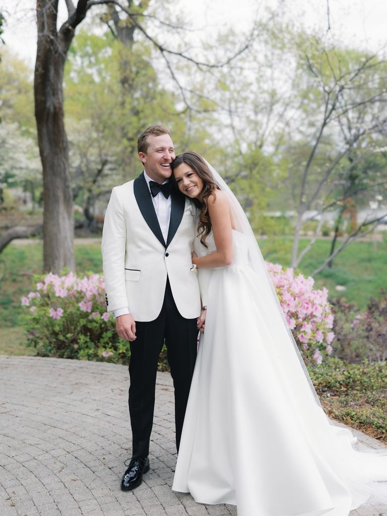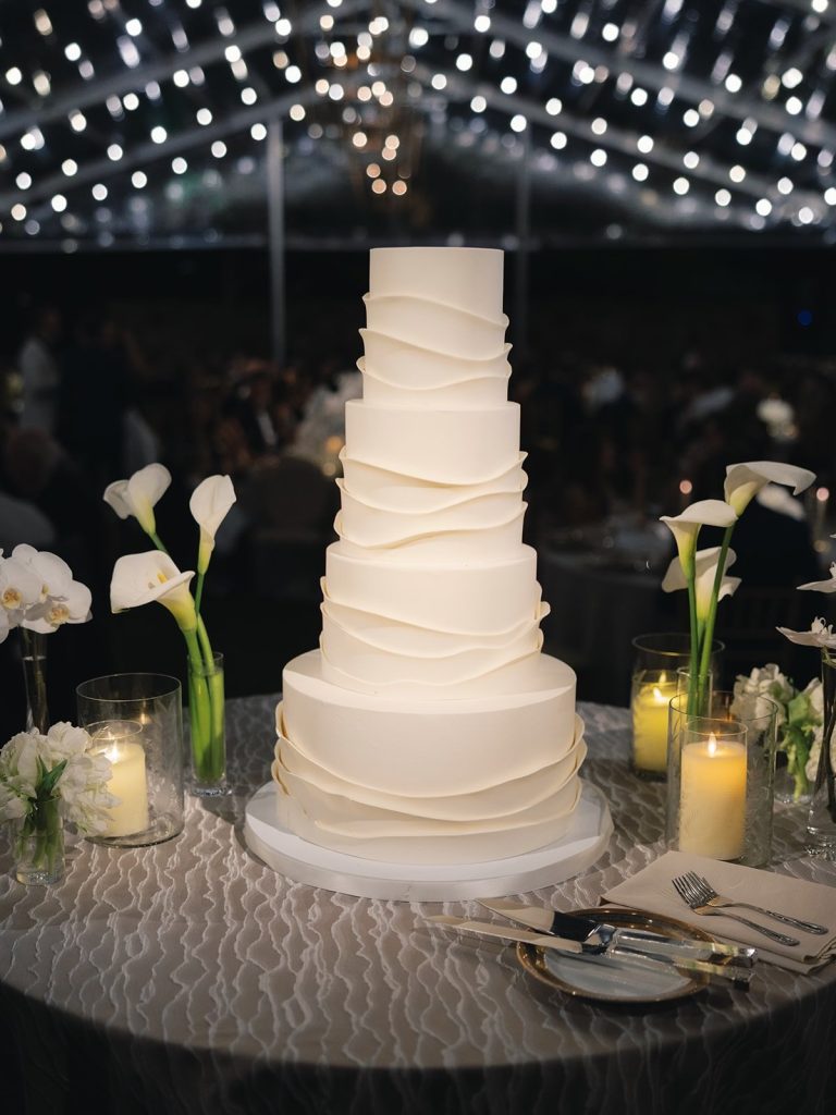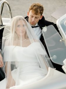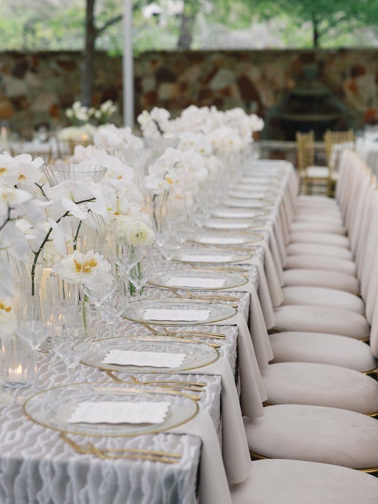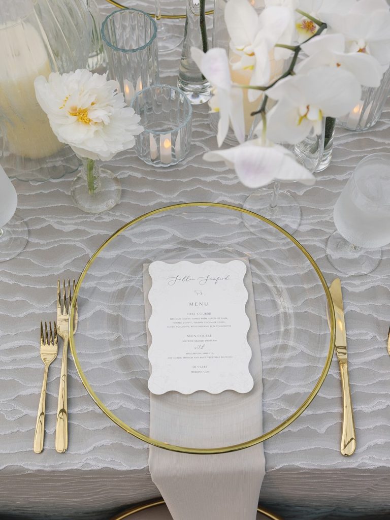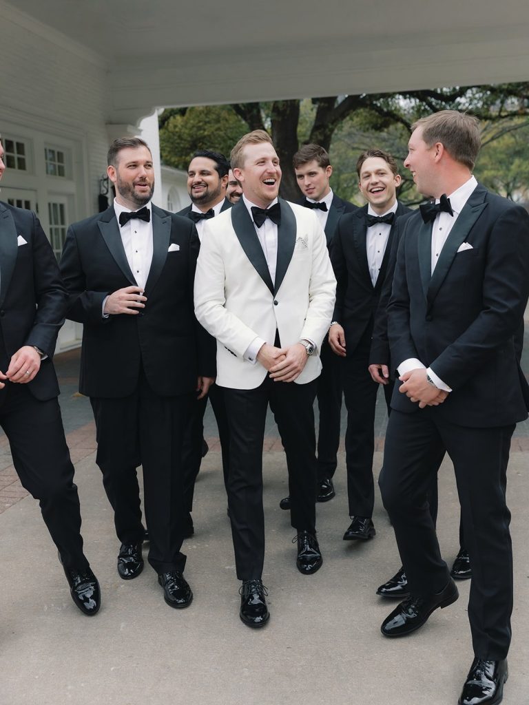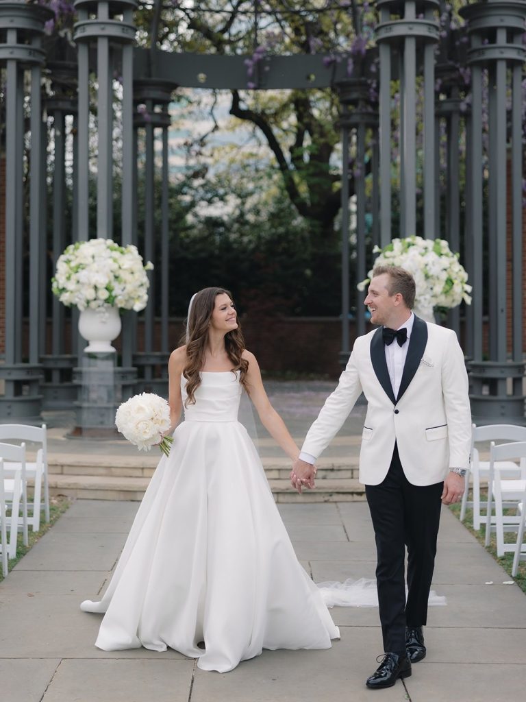 This stunning celebration blended garden romance with elevated black-tie style, creating a wedding day that felt effortlessly timeless. The bride and groom looked picture-perfect in coordinated white and black attire, setting the tone for a day full of refined simplicity. Soft white florals, lush greenery, and delicate gold accents brought the ceremony and reception spaces to life—from the elegant gazebo backdrop to the beautifully set long tables overflowing with blooms. Bridesmaids in muted sage tones added a subtle touch of color that complemented the natural surroundings. Every detail, from the sculptural cake to the chic invitation suite, came together to create a classic, elegant wedding that will forever feel in style.