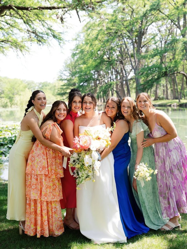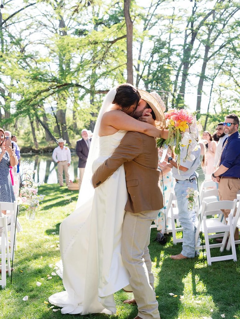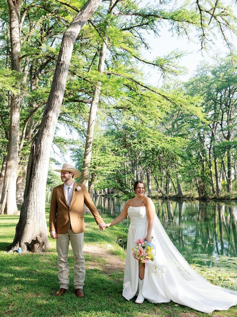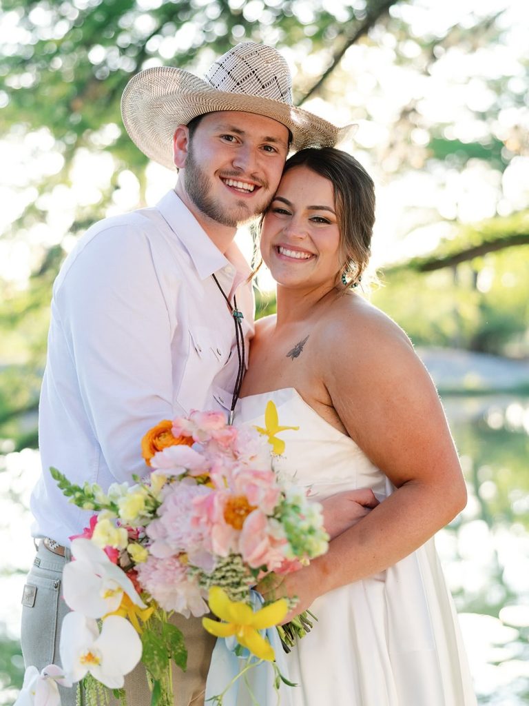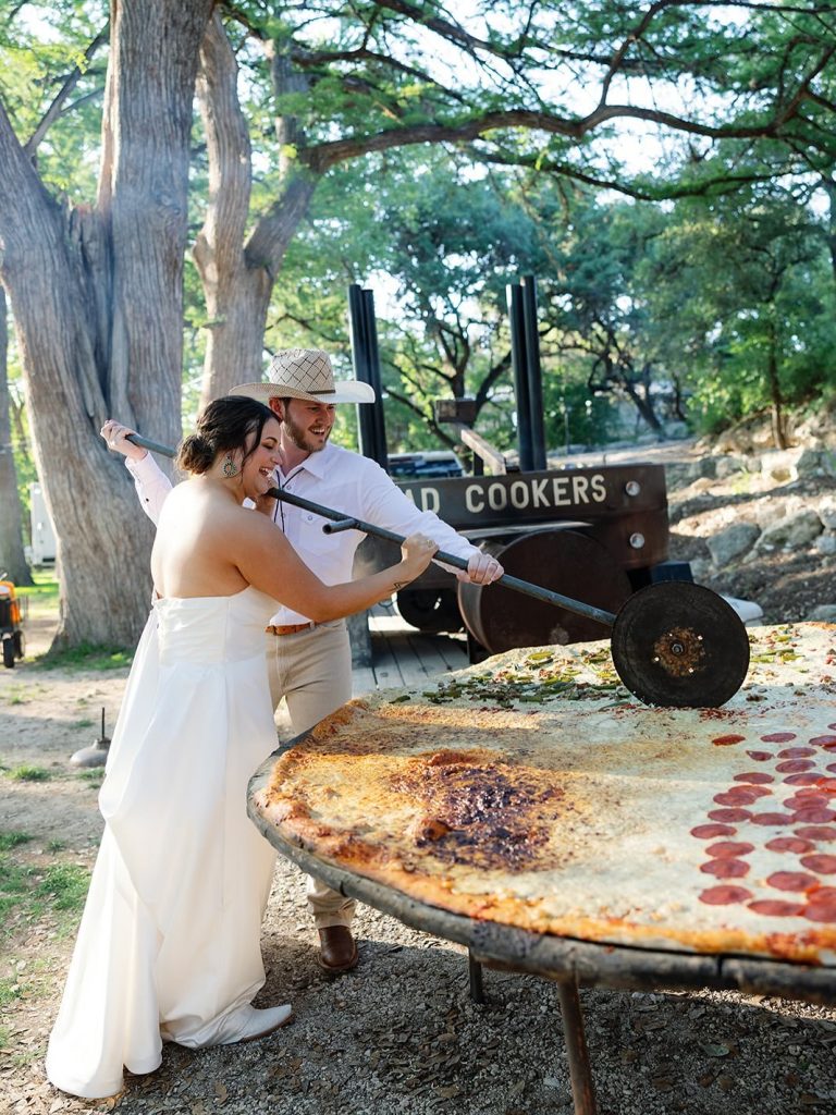 Beth and Brandon tied the knot beneath towering cypress trees along the serene Frio River, surrounded by vibrant wildflowers, cowboy hats, and pops of bold color. Their outdoor Texas Hill Country wedding blended rustic charm with joyful personality—from bridesmaids in colorful dresses to groomsmen sporting bolo ties and boots. The bride wore white boots beneath her classic gown and carried a bouquet bursting with cheerful spring blooms. After saying “I do,” the newlyweds made memories (and headlines) by slicing into a giant pizza instead of a traditional cake! The playful, laid-back atmosphere made for a wedding day that was as unforgettable as it was fun.