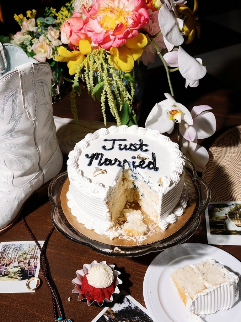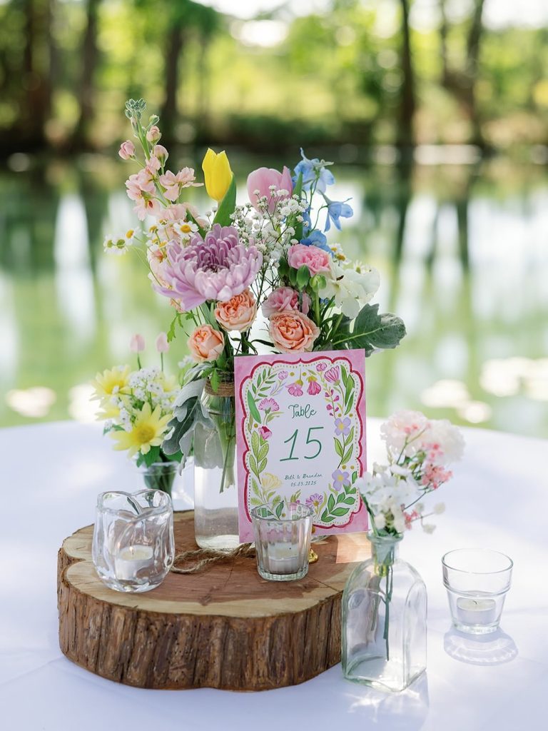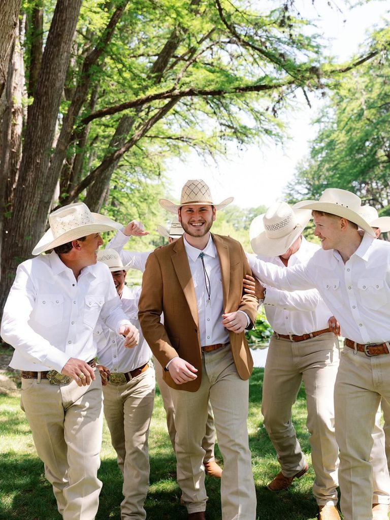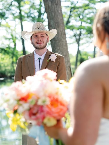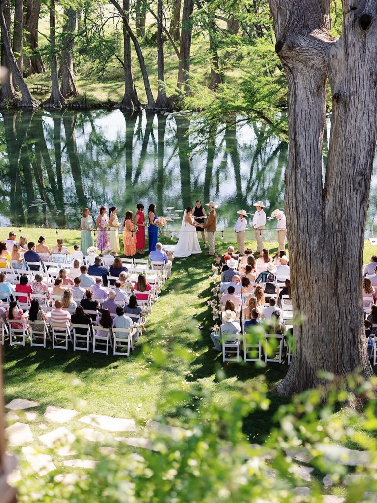 Beth and Brandon tied the knot beneath towering cypress trees along the serene Frio River, surrounded by vibrant wildflowers, cowboy hats, and pops of bold color. Their outdoor Texas Hill Country wedding blended rustic charm with joyful personality—from bridesmaids in colorful dresses to groomsmen sporting bolo ties and boots. The bride wore white boots beneath her classic gown and carried a bouquet bursting with cheerful spring blooms. After saying “I do,” the newlyweds made memories (and headlines) by slicing into a giant pizza instead of a traditional cake! The playful, laid-back atmosphere made for a wedding day that was as unforgettable as it was fun.