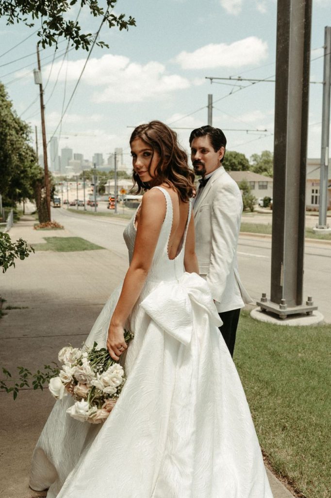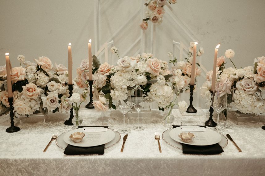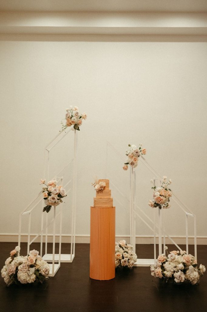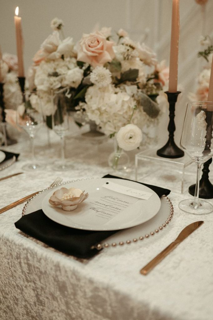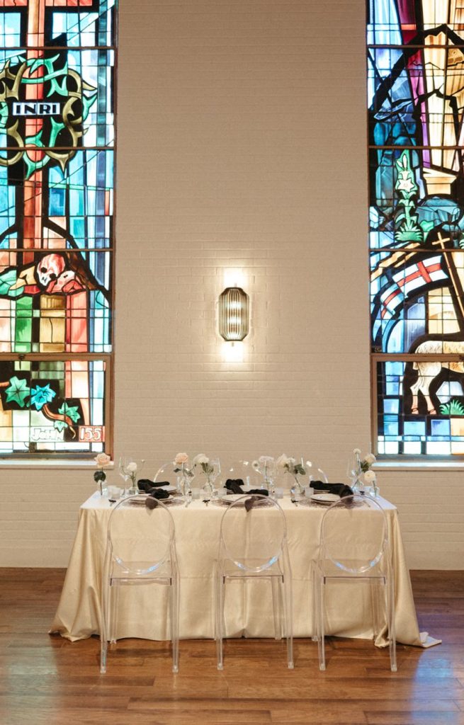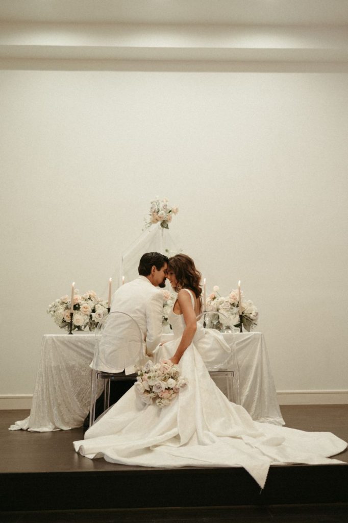 Blending two distinct wedding vibes can make some serious waves and this cityside wedding inspiration captured by the talented Vanessa Martin Photo Co. in dramatic indoor and outdoor weddingscapes totally brings a sense of chic elegance to the ever-trending cool girl style. Sleek signage and custom décor designed by Satin Pavement set the mood of the shoot while delicate shades of terracotta, blush and champagne contrast against mod black accents and gilded flatware creates a formal reception dining space abundant with feminine florals. Our brides model multiple looks that were complemented by changing settings and both gorgeous gals were styled by artists at Tease to Please Hair and Makeup – one with a low bun moment, the other with romantic waves, and each with dreamy soft glam makeup. Featuring two stunning wedding cake designs and beautiful brigadeiros to go around, sweets were in no short supply throughout this cityside wedding inspiration. See all the stylish scenes unfold down below. Cheers!