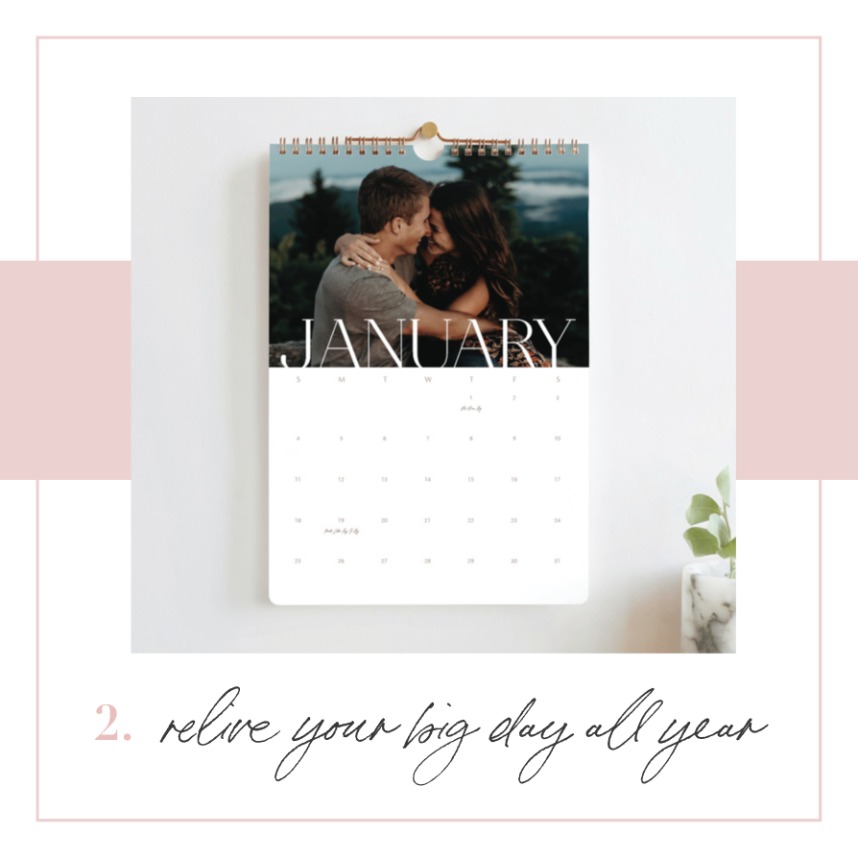 Create a calendar to hang in your home where each month you are reminded of a fresh memory from your wedding day. This is a fabulous way to reminisce all year long together. We suggest using this to plan all of your date nights month-by-month for that first year!