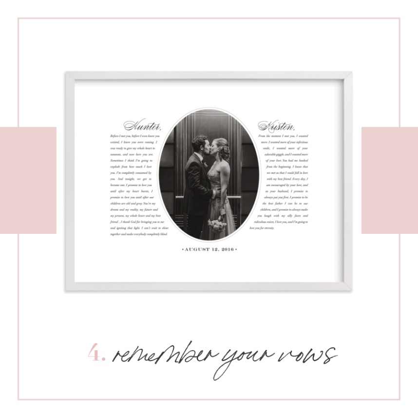 For all of you words of affirmation lovers, this one is for you! If your vows rank high on your favorite wedding details, this will help you be reminded of those sweet words each day! Minted offers this fantastic print where you can easily wrap your vows around your favorite wedding portrait for a lovely wedding day keepsake. You’ll want to hang this somewhere you see often.