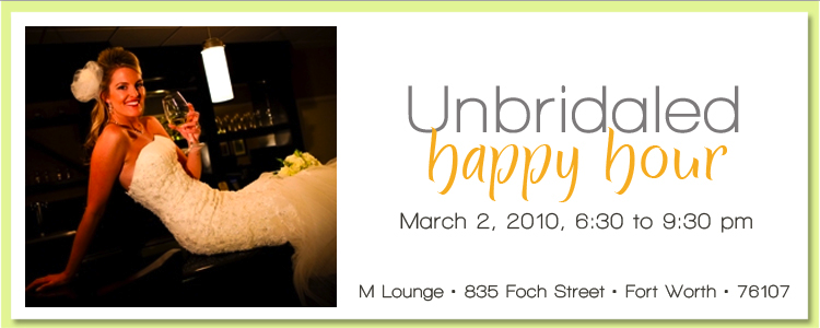 Unbridaled Happy Hour in Fort Worth is taking place next Tuesday, March 2 at M Lounge (next door to Bliss Bridal Salon)! If you are a bride: Stop by, have a cocktail or coffee, enjoy a snack, and meet with some of the best wedding professionals the area has to offer. If you are a wedding professional: Stop by, have a cocktail or coffee, and get to know some Fort Worth’s fabulous brides! Bliss Bridal Salon is giving away a $300 gift certificate for one lucky bride, so stop by for a chance to win! Fill out the R.S.V.P. form here. See you there!