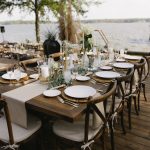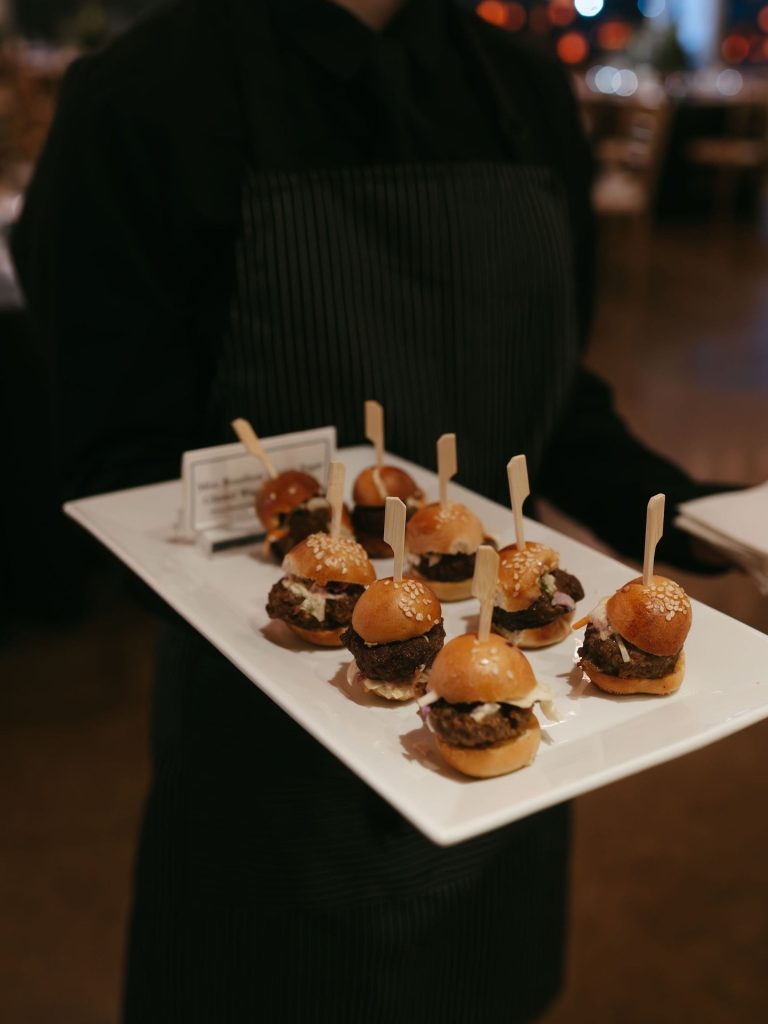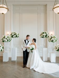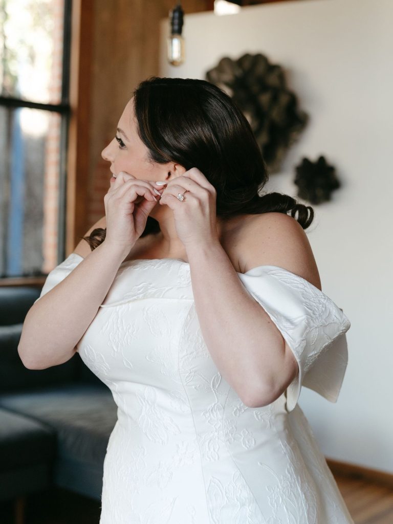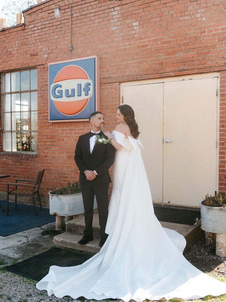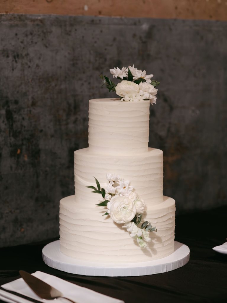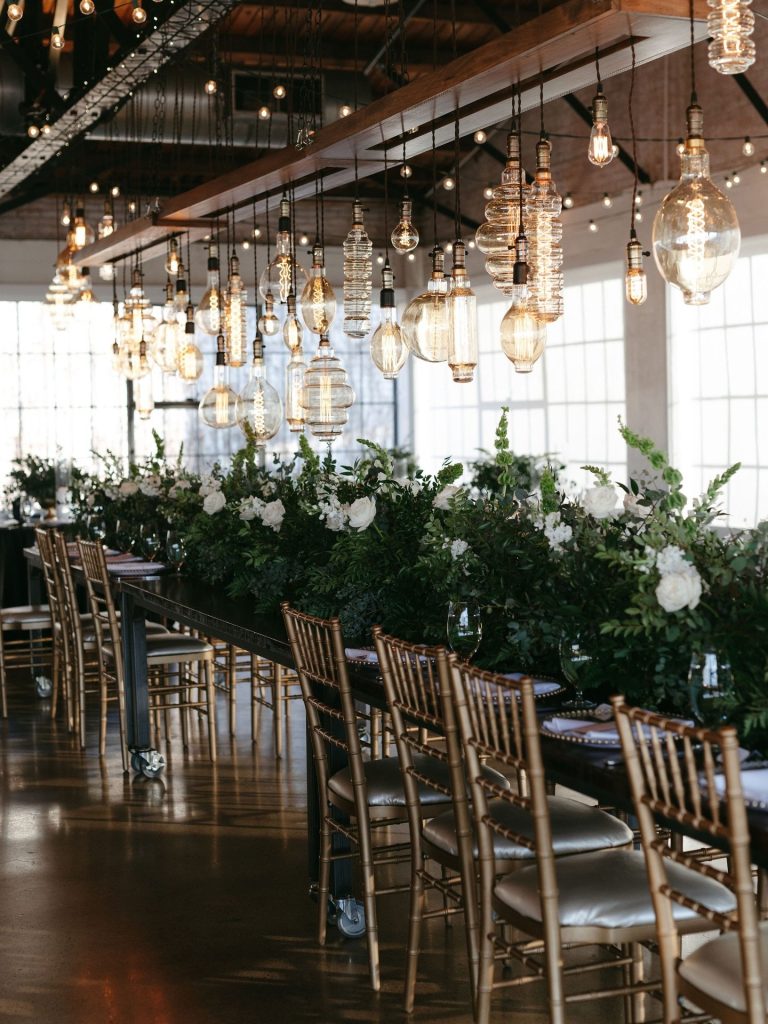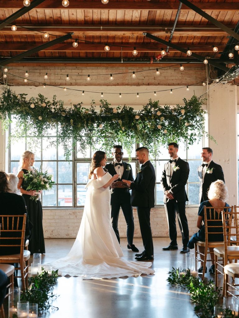 This stunning warehouse wedding blends industrial charm with timeless bridal style, creating a celebration that feels both elevated and effortlessly cool. Set against exposed brick, warm wood beams, and glowing café lights, the couple embraced a refined black-and-white palette softened by lush greenery and romantic white florals. The bride’s off-the-shoulder gown paired perfectly with the groom’s classic black tux, bringing a modern yet sophisticated feel to every moment. Thoughtful details like a textured tiered cake, elevated lounge-style seating, and passed bites added to the guest experience while keeping the focus on connection. From the statement lighting installation to the intimate ceremony setting, this wedding is the perfect inspiration for couples dreaming of a chic industrial wedding with a romantic edge.