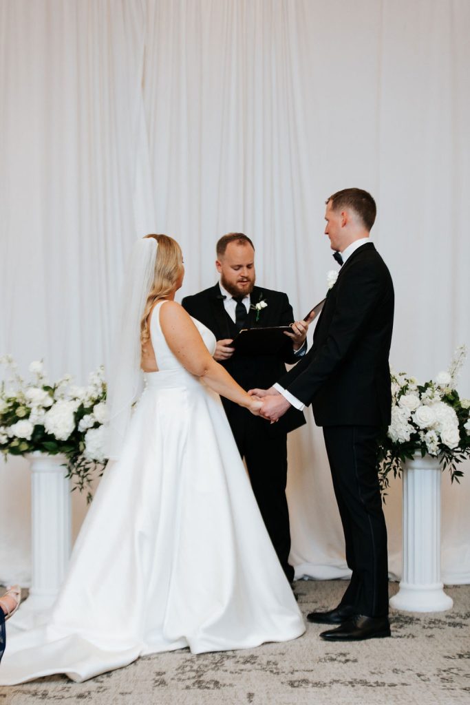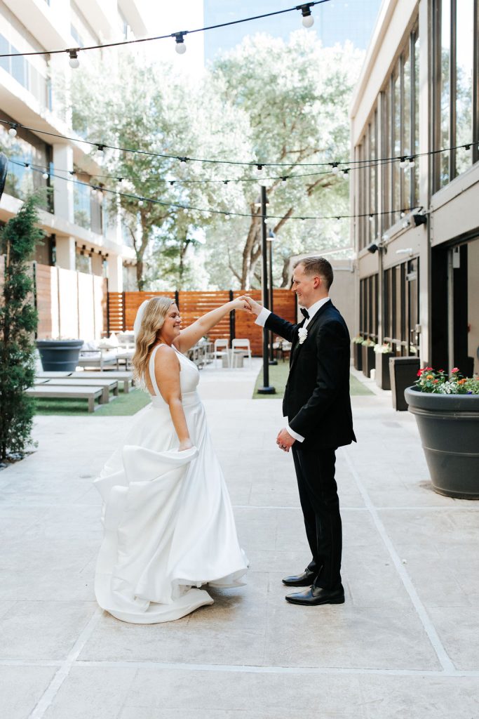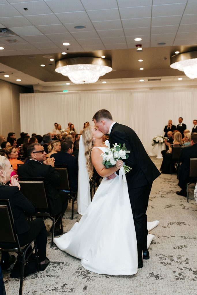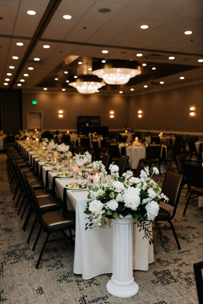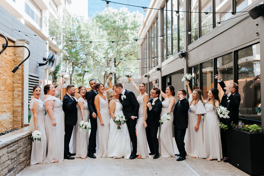 Kaylen and Eric’s wedding at The Beeman Hotel in Dallas was a stunning celebration of timeless elegance and modern romance. A classic black-and-white palette set the tone, with lush white florals, soft greenery, and candlelit tables creating a refined ballroom atmosphere. The couple shared an emotional indoor ceremony before transitioning into a sophisticated reception filled with heartfelt moments and joyful celebration. From Kaylen’s sleek bridal look to the elevated city setting, every detail came together beautifully for this unforgettable Dallas hotel wedding.