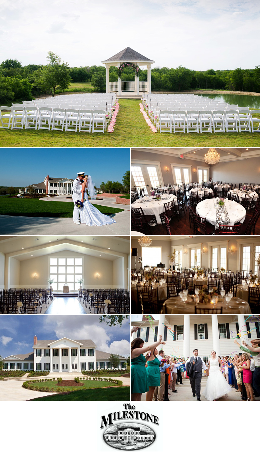 Located in Denton County, The Milestone has convenient access to the entire DFW metroplex, yet it is nestled on 14 acres of beautiful countryside! It’s incredible Southern mansion offers both indoor and outdoor ceremonies. The ceremony room has a floor to ceiling window wall that overlooks the calm countryside. The Milestone‘s grand ballroom seats up to 300 people and features crystal chandeliers and decorative sconces. For more information or to book a tour of their wonderful facility, visit The Milestone online or call 940-479-2223.
