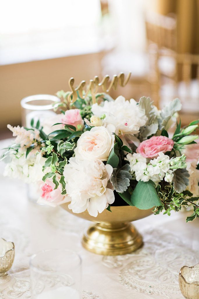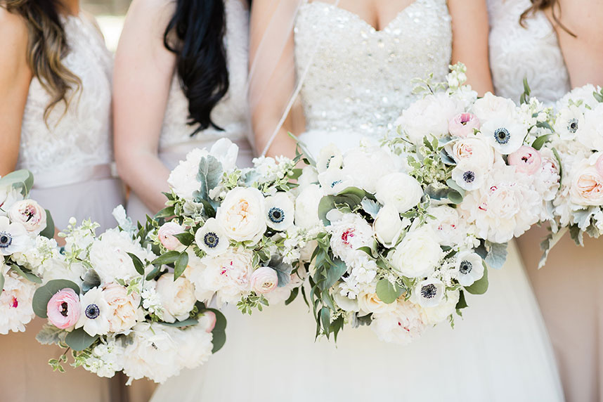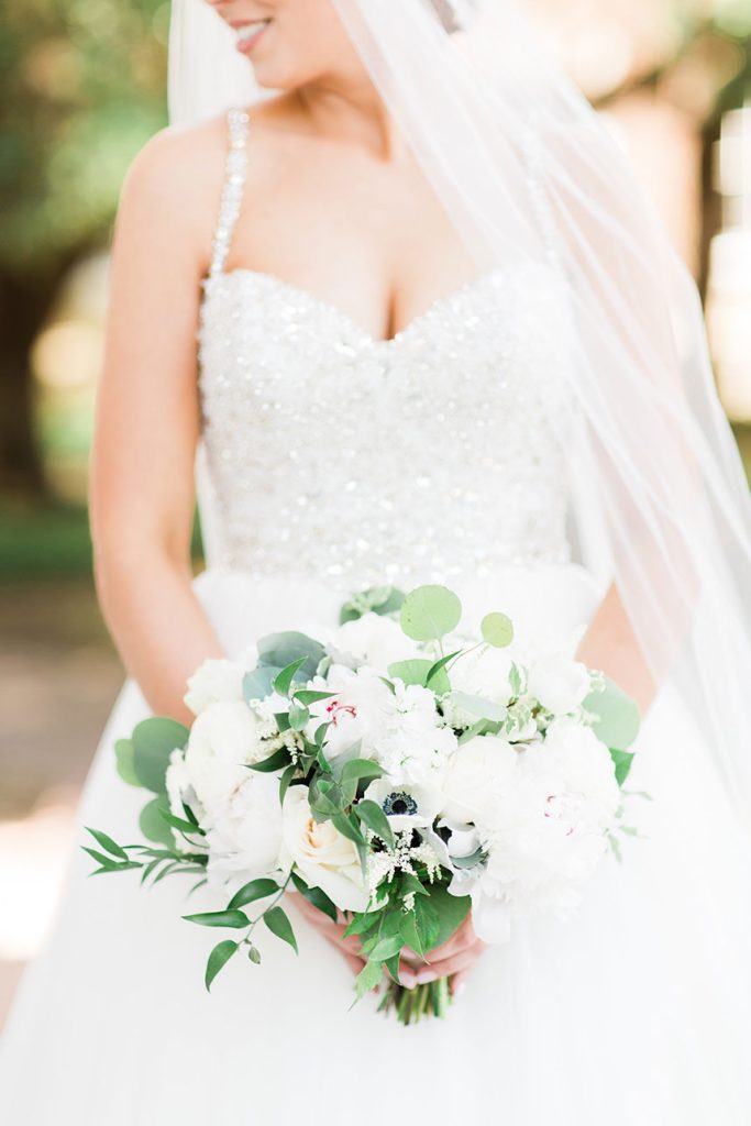 BEAUTIFUL BLOOMS: Meredith carried a rounded-style bouquet made with the most beautiful florals. Blush and ivory garden roses, vendella roses, peonies, ranunculus, astilbe and a hint of dusty miller and eucalyptus wrapped together in ivory perfectly complemented the bride.