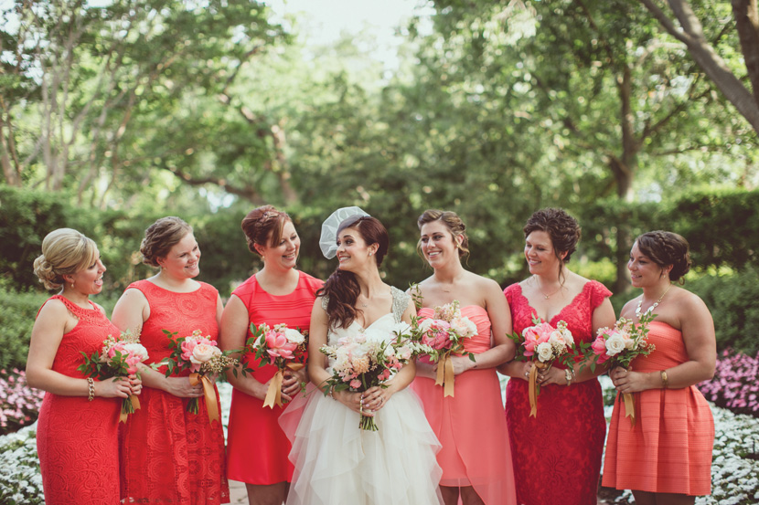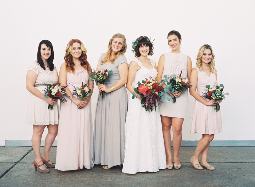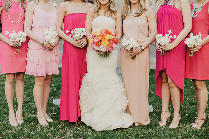 We often have clients that think if they allow their bridesmaids to simply select a dress of their choice within given parameters (i.e. wear a blush colored dress), then they will achieve a mix and match look. However, the quintessential mix and match look needs much more direction provided, usually by a professional stylist, in order to create a harmonious blend of styles, colors, textures, etc.