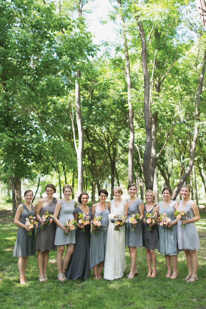 Subtle or neutral colors usually work best for mix and match. This doesn’t mean you have to choose pastel colors, it just means colors that aren’t overly bold or bright as you don’t want the difference in texture and styles to be completely overwhelmed by extremely strong color. If you like bolder colors, consider an ombre look, in which you may have 1 or 2 dresses that are a more saturated color and then the other dresses would be more subtle tones of that shade similar to a paint card at Sherwin Williams.