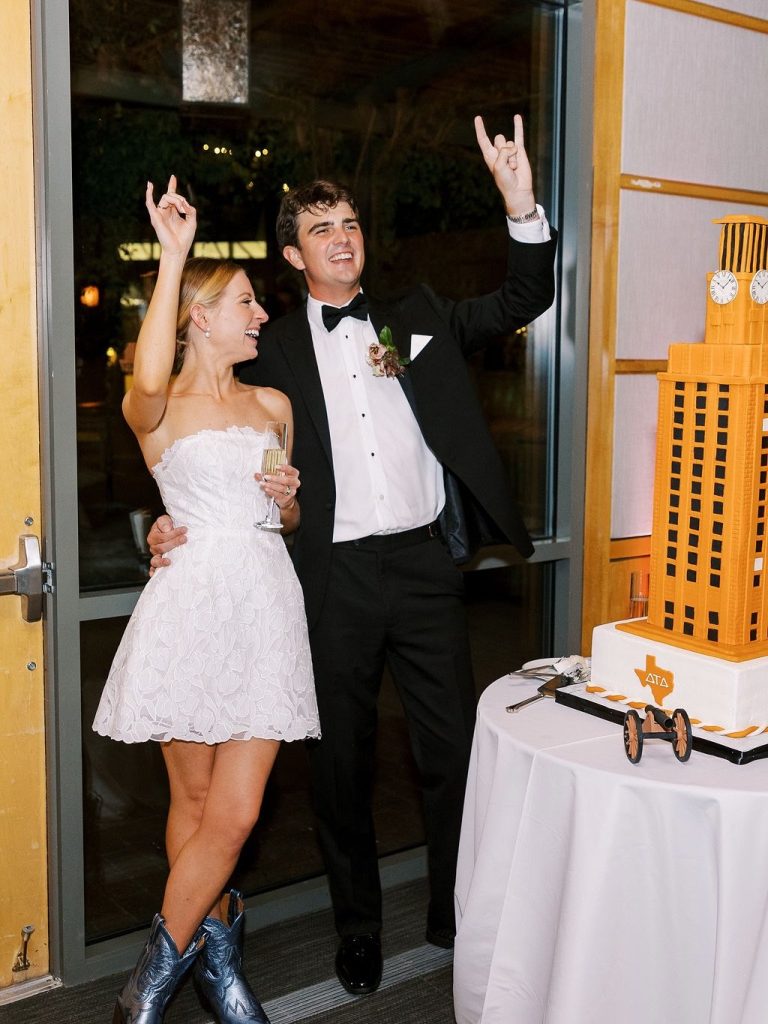 Olivia and William celebrated their wedding day surrounded by the lush gardens and waterfront views of Dallas Arboretum, creating a romantic setting for their timeless celebration. Olivia wore a stunning gown from Stanley Korshak Bridal Salon that perfectly complemented the classic garden aesthetic. Emerald bridesmaid dresses, soft floral details, and elegant tablescapes added a refined touch to the outdoor reception. Guests enjoyed an unforgettable dining experience from Vestals Catering, while a beautifully crafted groom’s cake by Sugar Bee Sweets Bakery added a sweet and personal moment to the celebration. The day blended timeless style with the natural beauty of one of Dallas’s most iconic wedding venues.