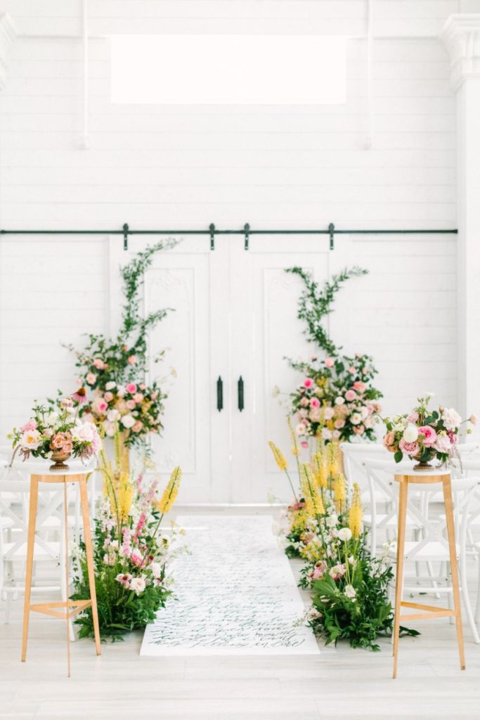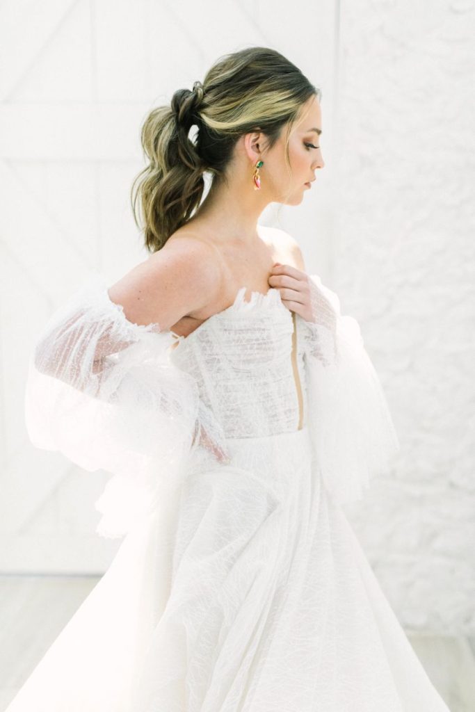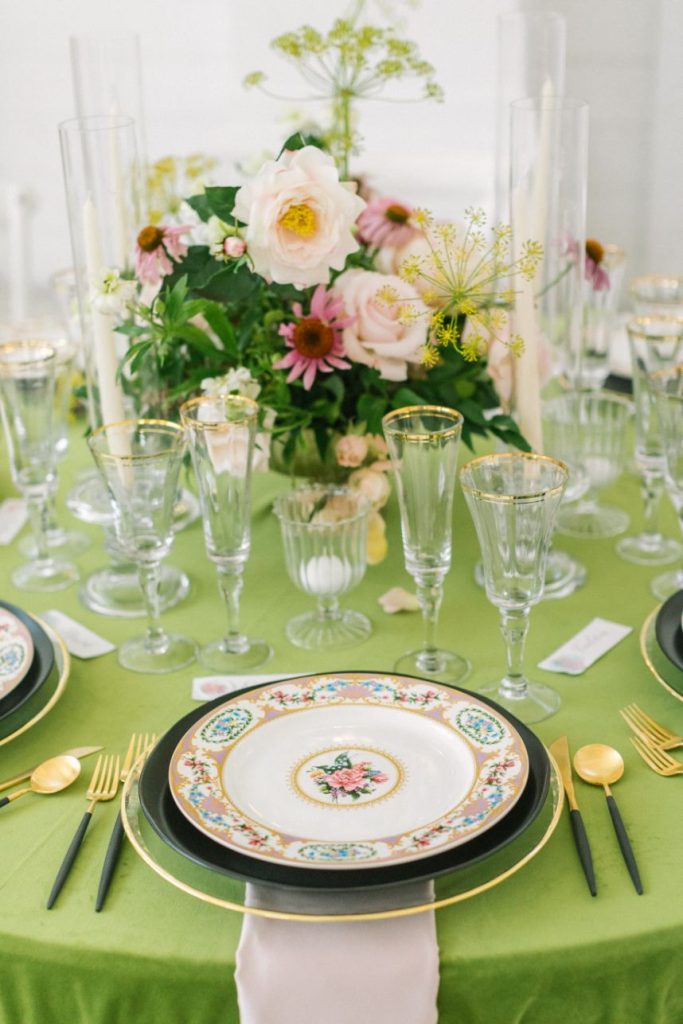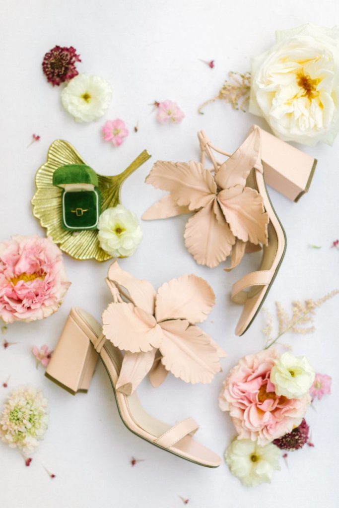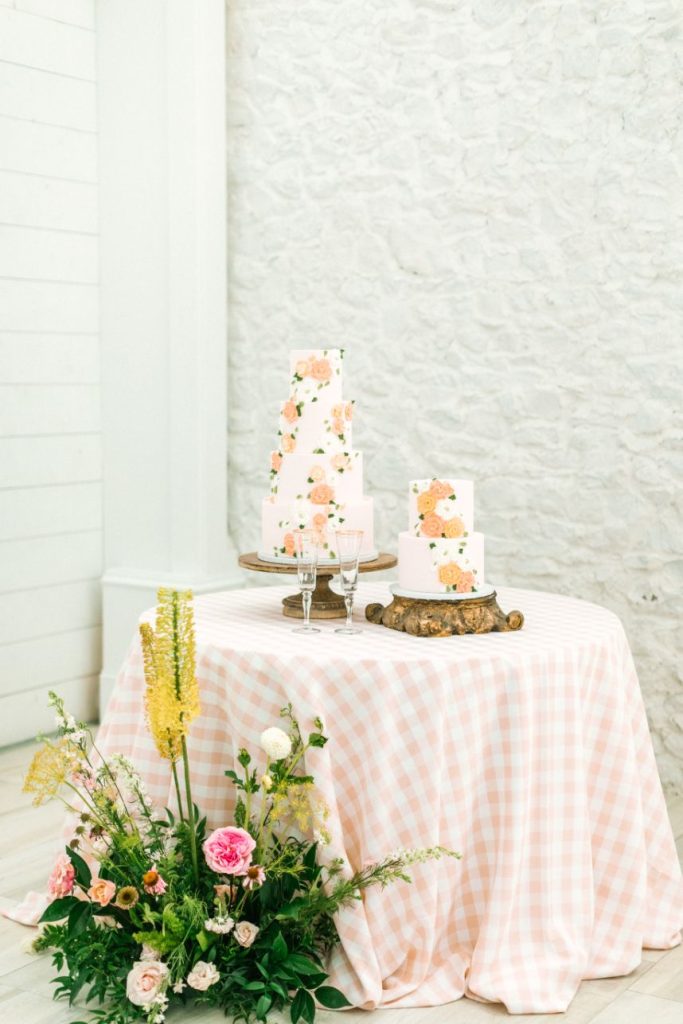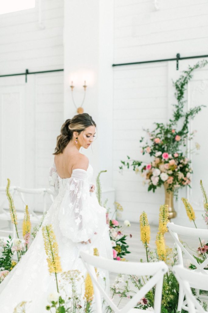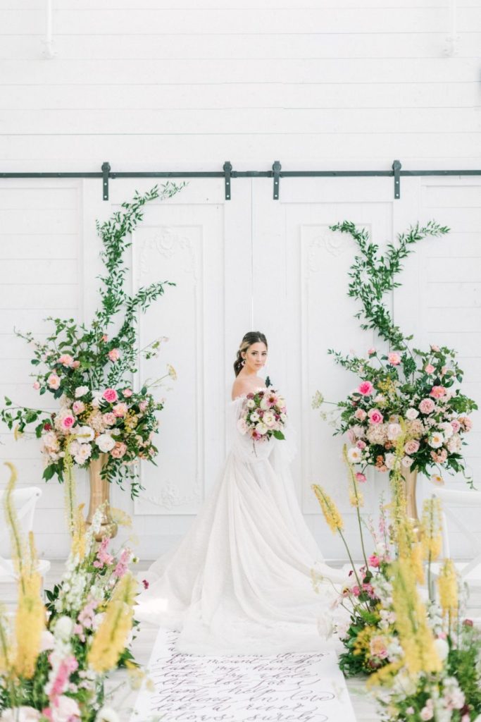 It may be only a coincidence that St. Patrick’s day is right around the corner, but we still have the luckiest feeling about this fresh, green spring wedding inspiration just blooming with botanicals and romance. The Nest at Ruth Farms offers a clean canvas for your bespoke wedding design to come to life quite as this styled shoot did in bright, modern scenes. A beautiful bride model showcases the most darling off-the-shoulder ballgown from Stanley Korshak Bridal Salon that was styled with a whimsical party pony and flawless warm-toned makeup by the artists at Tease to Please Hair and Makeup who had her truly glammed to perfection. From the romantic script that led our bride down the aisle to the peachy floral cakes that wait to be enjoyed by guests, this spring wedding inspiration feels as warm and inviting as the season itself. Find the full photo gallery of this dreamy green day down below. (Plus, bonus points if you can find the sweet pup that’s hiding in one of the pics!) Cheers to this preppy spring wedding inspiration!