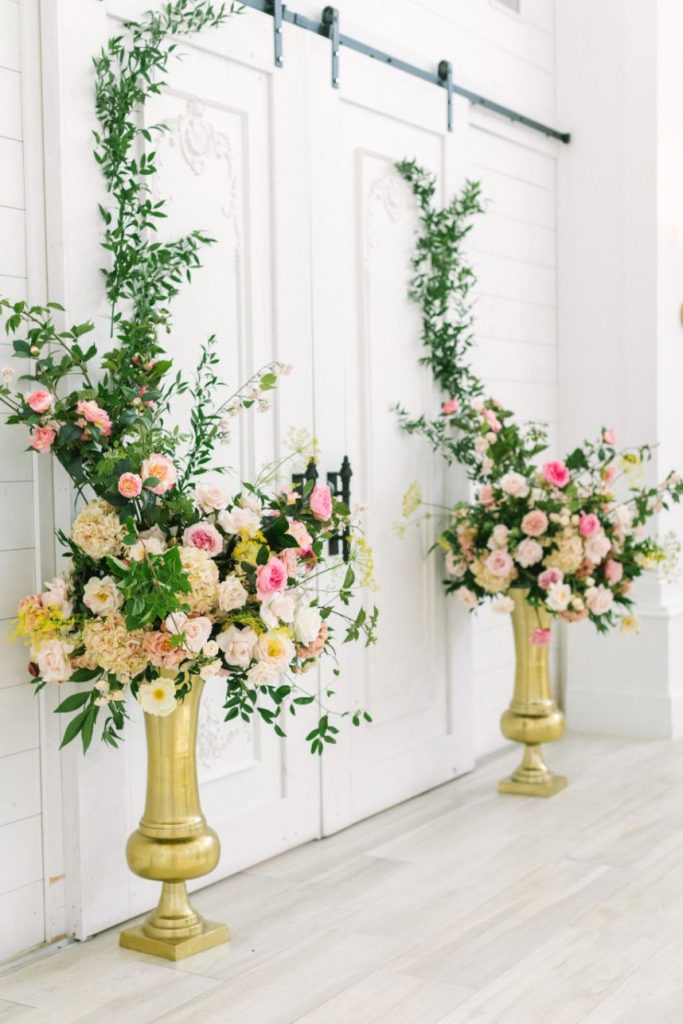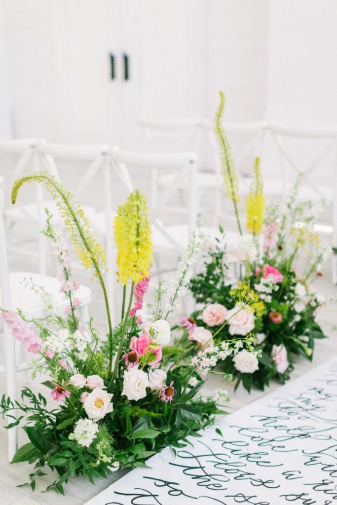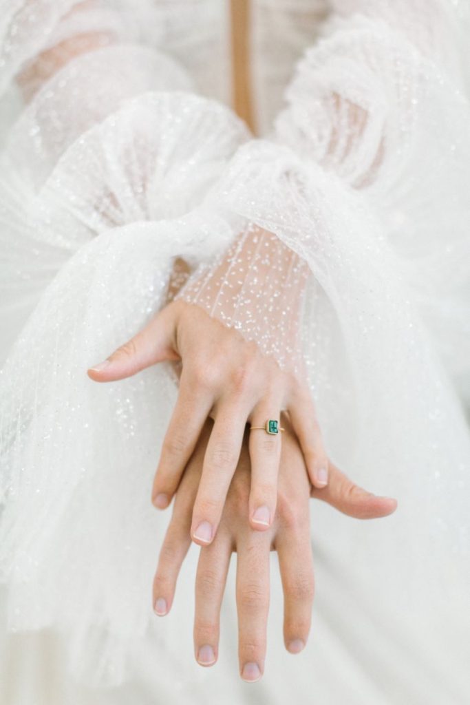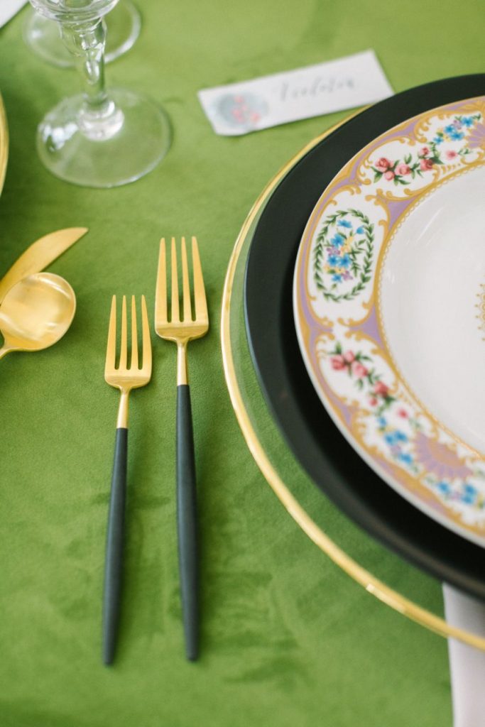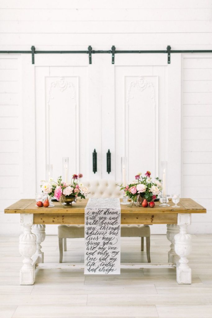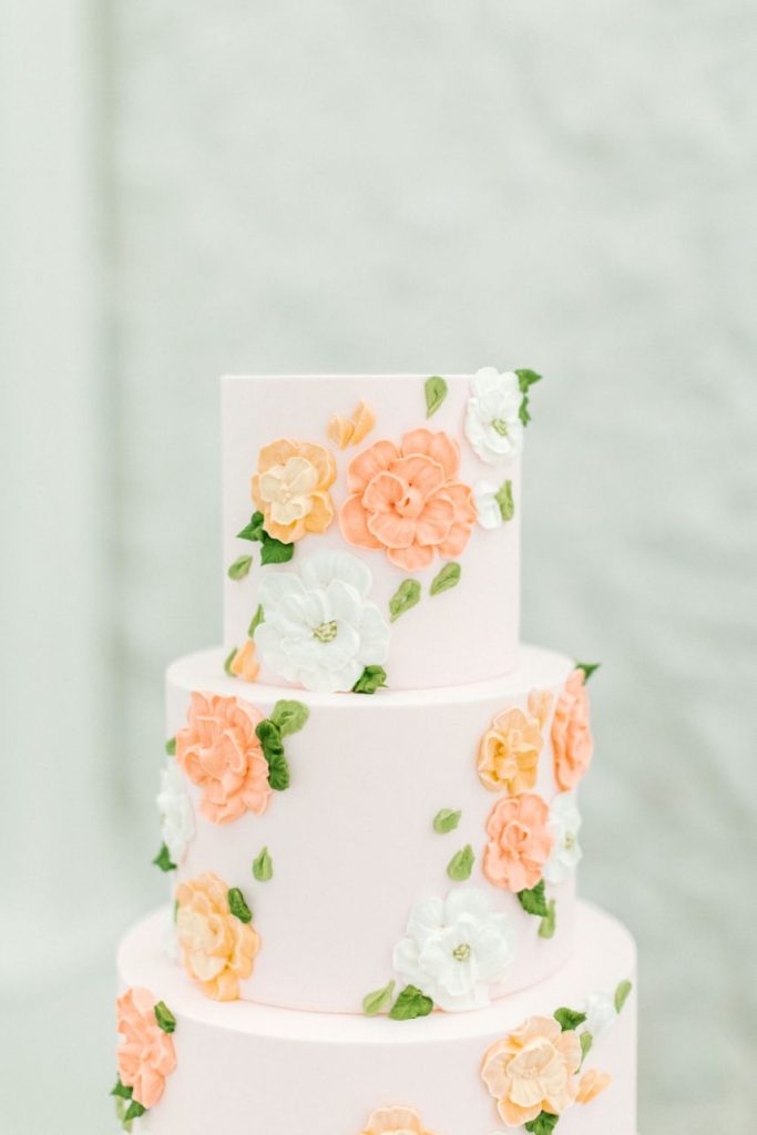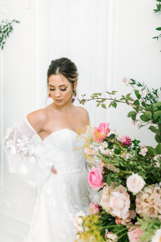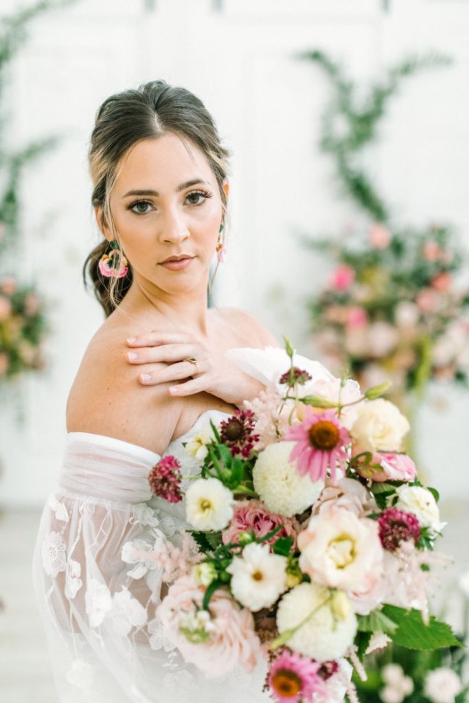 It may be only a coincidence that St. Patrick’s day is right around the corner, but we still have the luckiest feeling about this fresh, green spring wedding inspiration just blooming with botanicals and romance. The Nest at Ruth Farms offers a clean canvas for your bespoke wedding design to come to life quite as this styled shoot did in bright, modern scenes. A beautiful bride model showcases the most darling off-the-shoulder ballgown from Stanley Korshak Bridal Salon that was styled with a whimsical party pony and flawless warm-toned makeup by the artists at Tease to Please Hair and Makeup who had her truly glammed to perfection. From the romantic script that led our bride down the aisle to the peachy floral cakes that wait to be enjoyed by guests, this spring wedding inspiration feels as warm and inviting as the season itself. Find the full photo gallery of this dreamy green day down below. (Plus, bonus points if you can find the sweet pup that’s hiding in one of the pics!) Cheers to this preppy spring wedding inspiration!