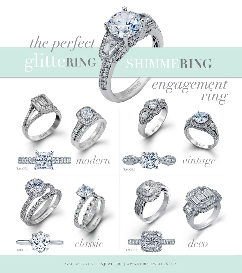 Ring in the New Year with a sparkling diamond ring from Kubes Jewelers! When it comes to finding that life-long piece of jewelry that will forever define your love, stay true to yourself with a shimmering engagement ring that perfectly reflects your style. Whether your style is modern or vintage, deco or classic, the options for stunning rings are endless, and these incredible designs from designers Simon G. and Tacori will leave any lucky left finger dazzling!