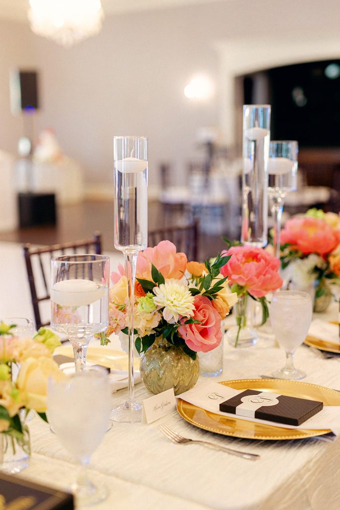 Carolyn looked radiant in a classic satin gown, while Jeff complemented her perfectly in a timeless black tuxedo. The reception featured a palette of bright florals and gold accents, with beautifully curated table settings and an exquisite tiered cake adorned with fresh flowers.