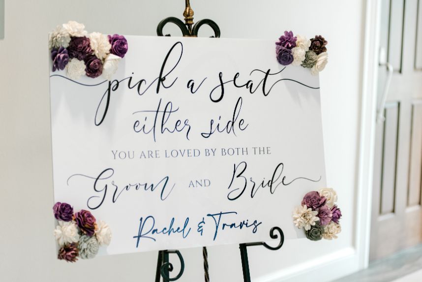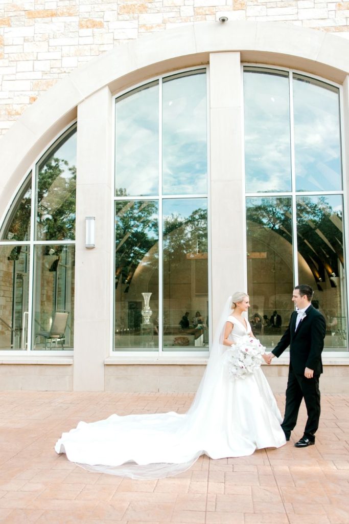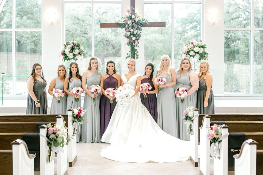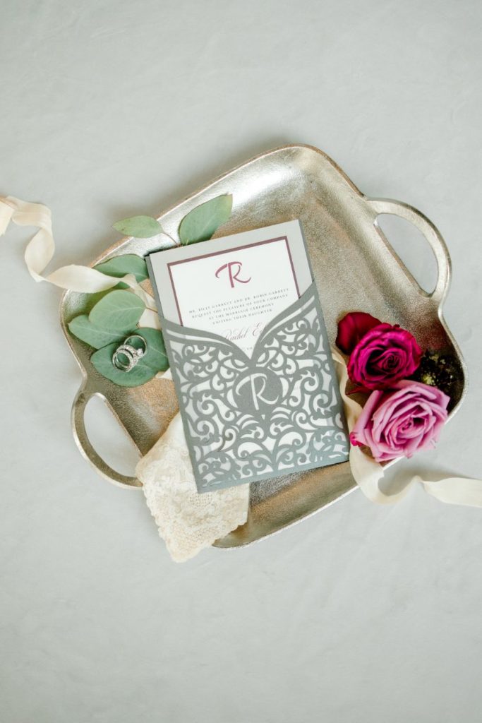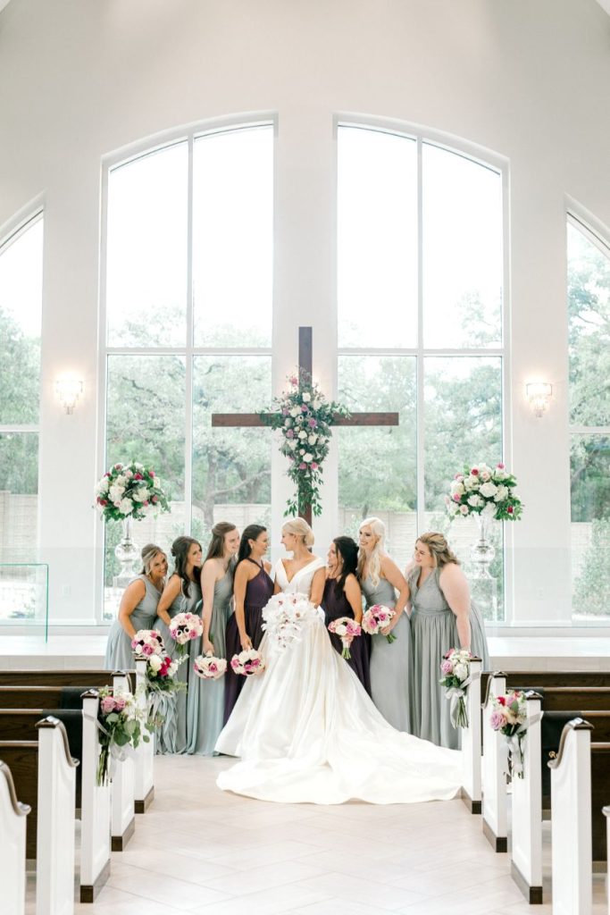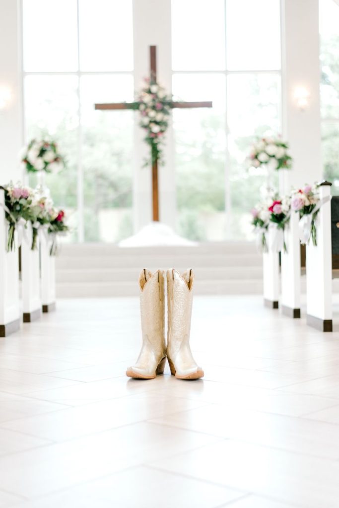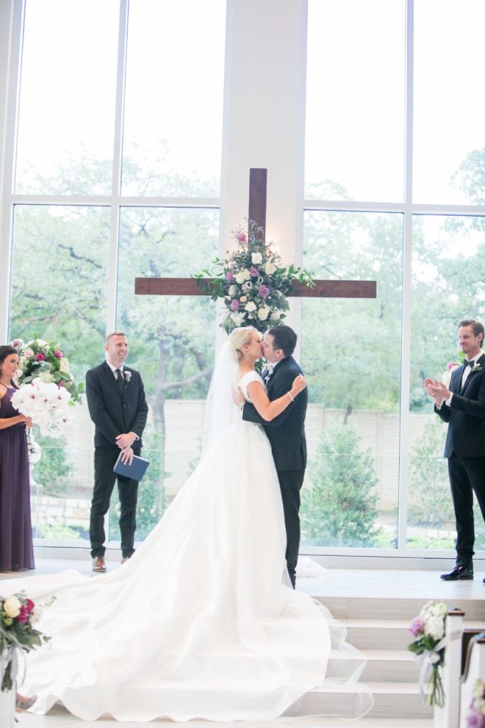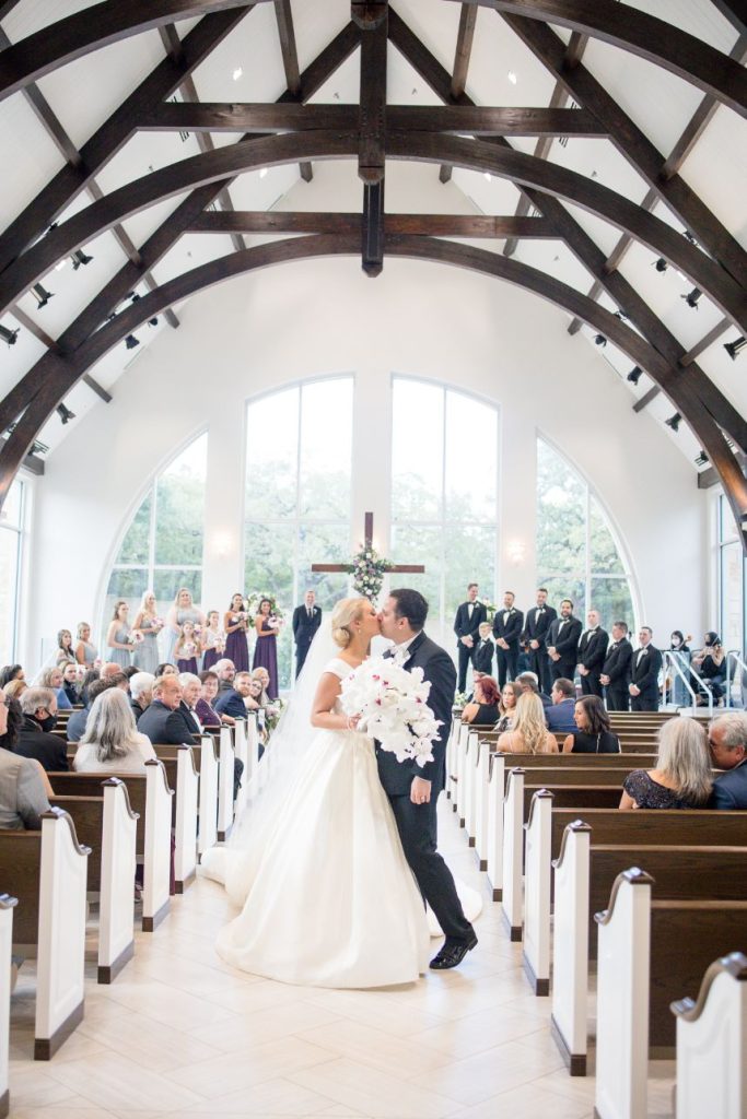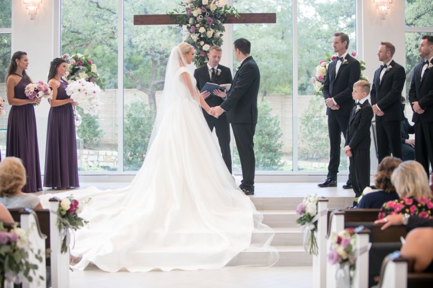 There are a few subtle rustic touches throughout this plum wedding planned and designed by Weddings by StarDust to be so full of simplistic elegance that they go just perfectly! Classic and clean with a bright white palette, grays and purply plum hues accent a timeless chapel ceremony where Rachel and Travis said “I do” in front of big, beautiful windows and a floral-adorned cross altar installation to honor their shared faith. Another lovely way Rachel incorporated tradition into their big day was through something old, something new, something borrowed and something blue. Her something old was her maternal great-grandmother’s handkerchief that was also carried by Rachel’s mother in her wedding as well as a silk flower made by her maternal grandmother. Her something new was a custom gown from LeAnn’s Bridal designed by the bride with help from fashion designer Matthew Christopher to feature an extended cathedral train and veil. She looks absolutely radiant in it, and we love it paired with her white bridal boots for a fun country touch! Her maternal grandmother’s pearl pin, as well as her mother’s pearl Tiffany & Co. bracelet given to her by Rachel’s father, served as the bride’s something borrowed, and she kept with her a Tiffany “Something Blue” charm. Tasteful décor from Lawson Event Rentals brings style and class while arrangements of romantic florals were strategically placed for the maximum amount of luxury around these wedding scenes. It’s impossible not to fall for this elegant plum wedding with a few rustic touches! Read on for a note from the bride about her favorite wedding day memory. Cheers to the Campbells!