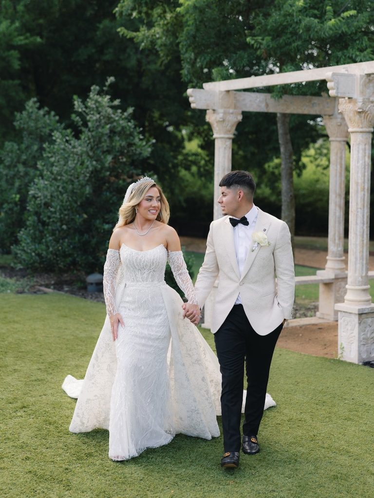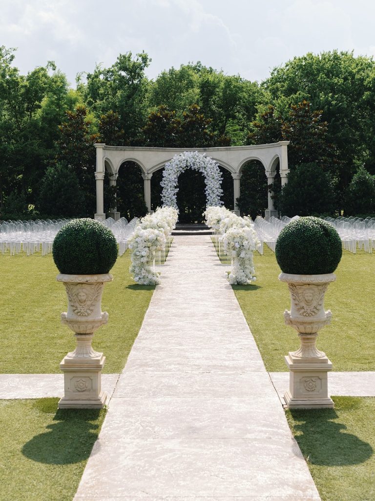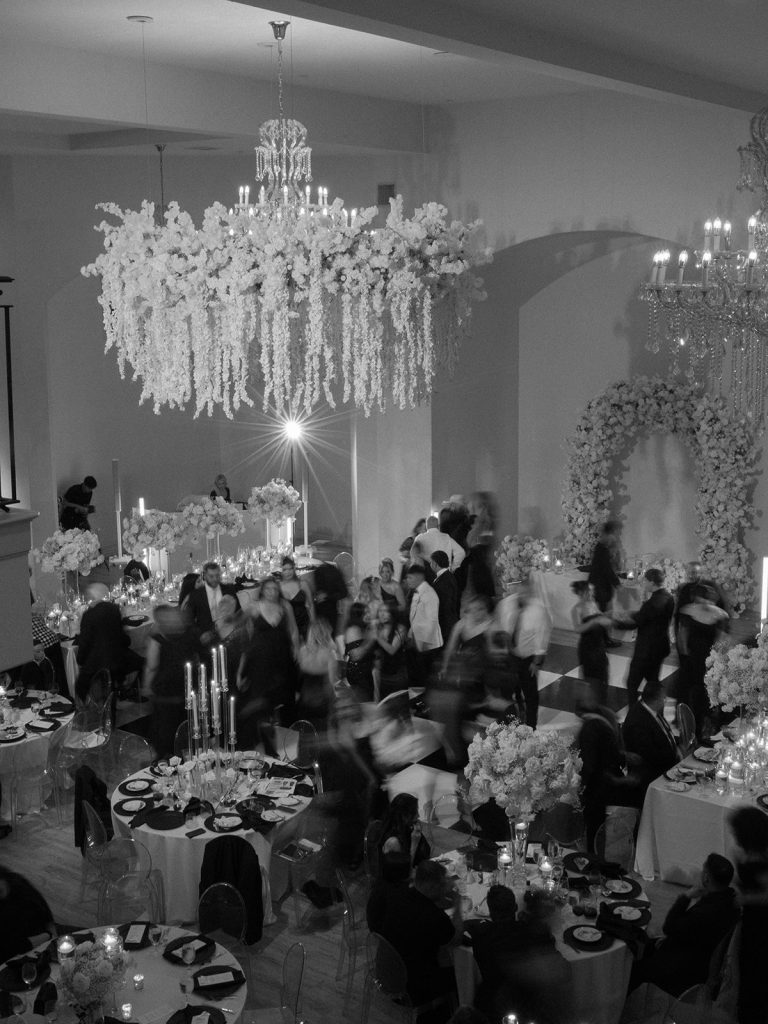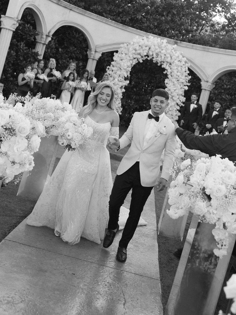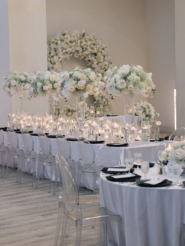 Camryn and Kyson’s wedding was a breathtaking display of modern elegance, blending an all-white floral palette with luxurious black-tie details. Their outdoor ceremony featured a sweeping floral arch and manicured garden walkway, creating a truly unforgettable backdrop. Inside the reception, cascading chandeliers, candlelit tablescapes, and elevated white blooms transformed the space into a romantic dreamscape. Every detail—from the refined stationery to the chic black-and-white place settings—enhanced the couple’s sophisticated vision. This timeless celebration is the perfect inspiration for couples seeking a classic, all-white luxury wedding aesthetic.