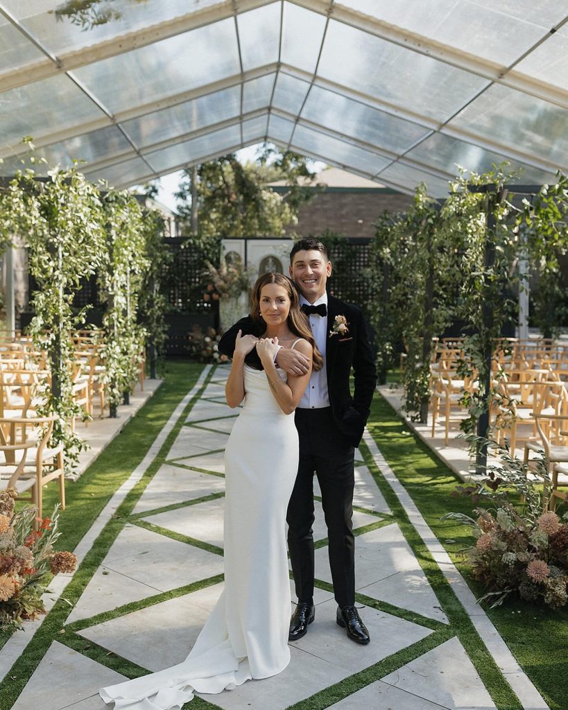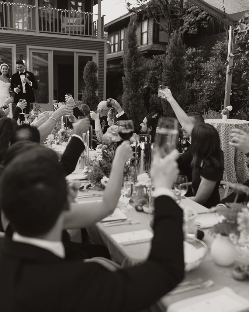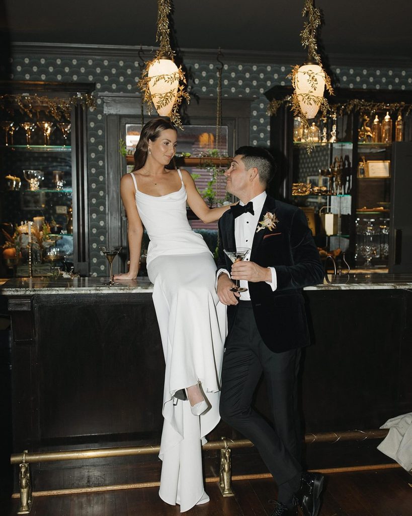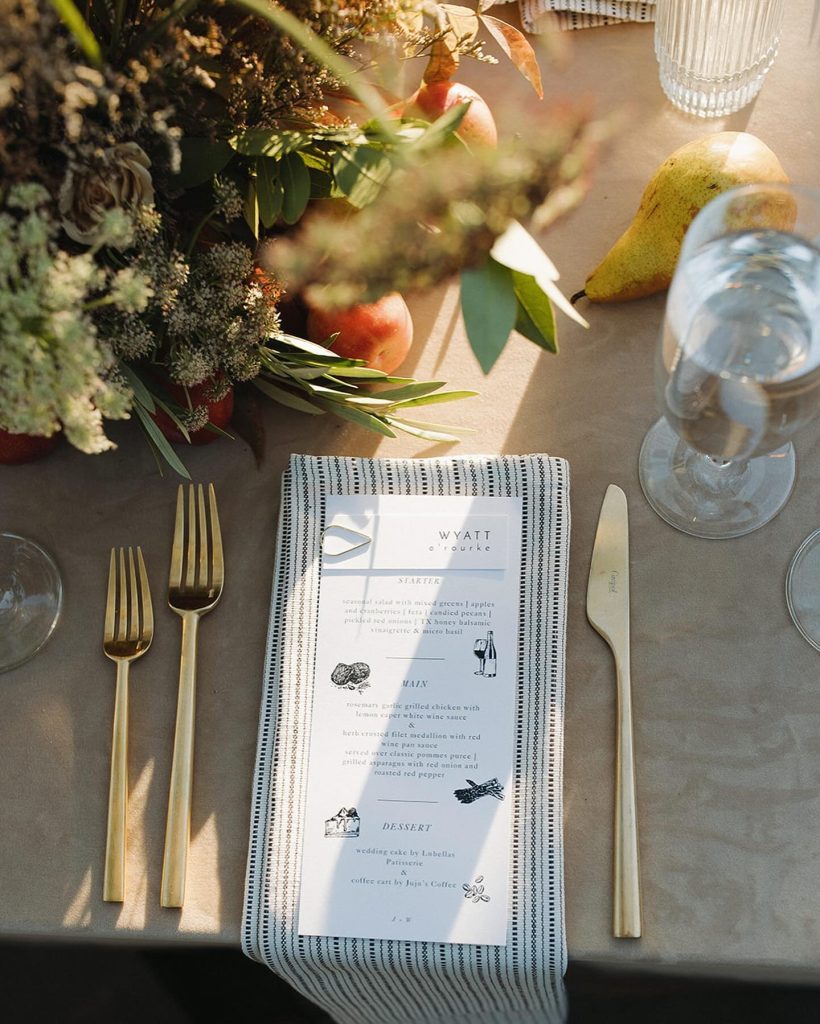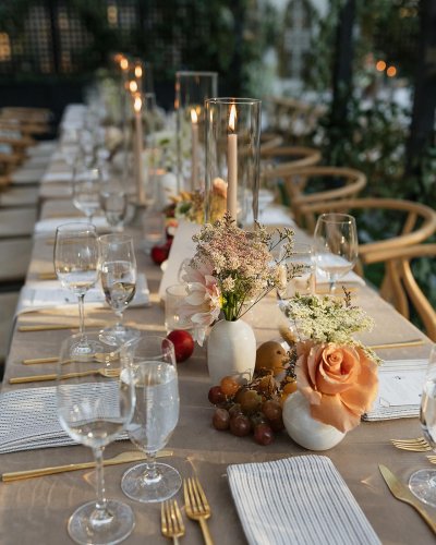 The reception setup is equally captivating, with a mix of textures from linen to organic floral arrangements, perfectly complemented by fruit accents. Every detail, from the intimate tablescape to the open-air, ethereal ceremony backdrop, embodies an effortlessly chic atmosphere that reflects the couple’s taste for modern sophistication.
