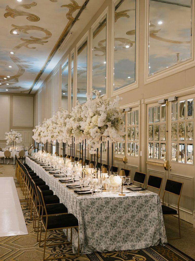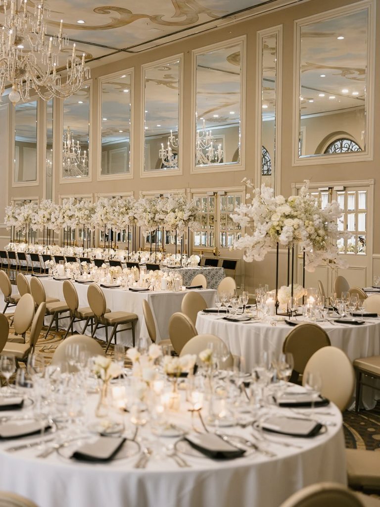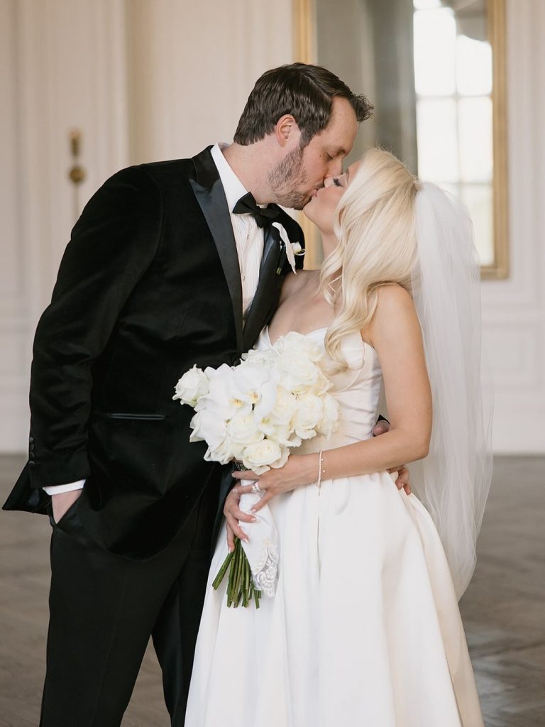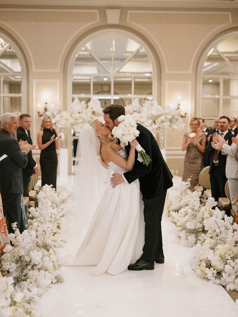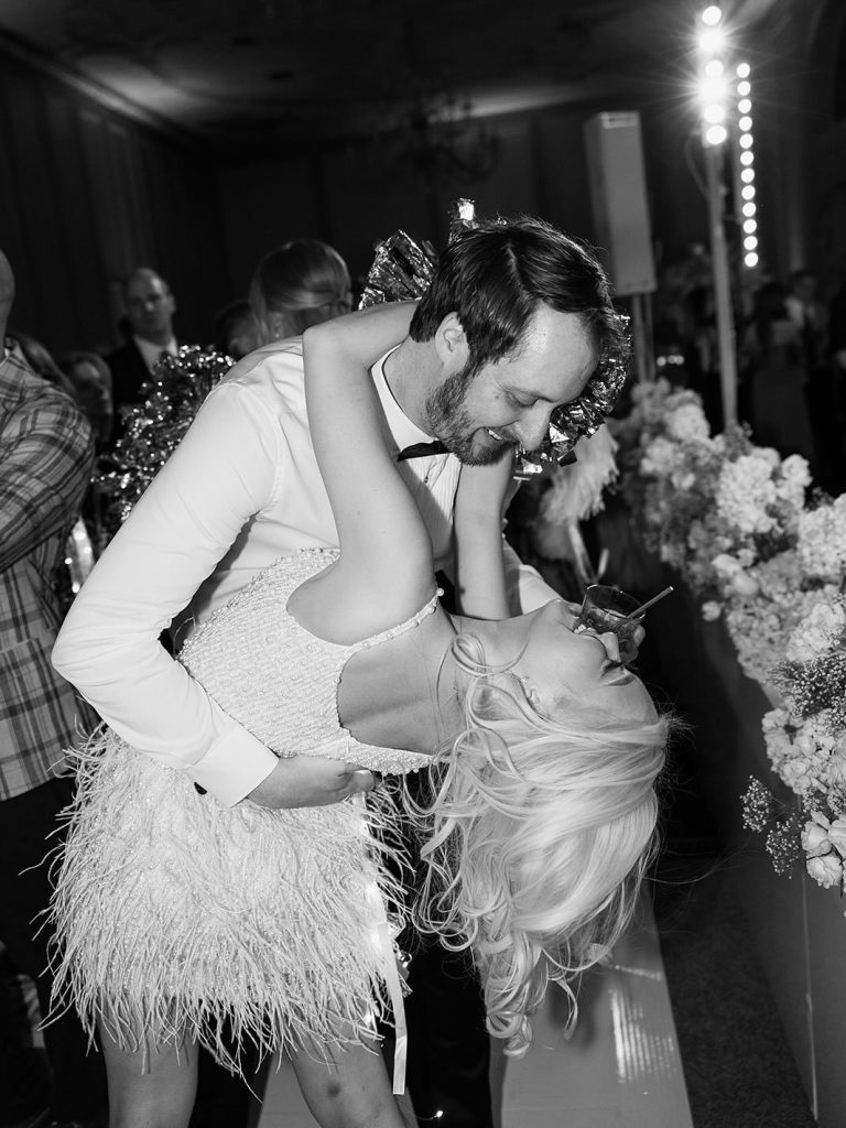 This black-tie wedding at The Adolphus Hotel was a stunning blend of classic elegance and modern sophistication. The bride wore a sleek strapless gown for the ceremony and changed into a sparkling number for the reception. A chic palette of white, black, and gold set the tone for a refined celebration, with towering florals and candlelit tables transforming the ballroom. From heartfelt moments to a packed dance floor, every detail reflected timeless glamour and pure joy.