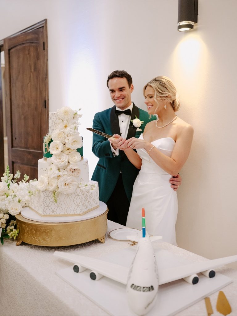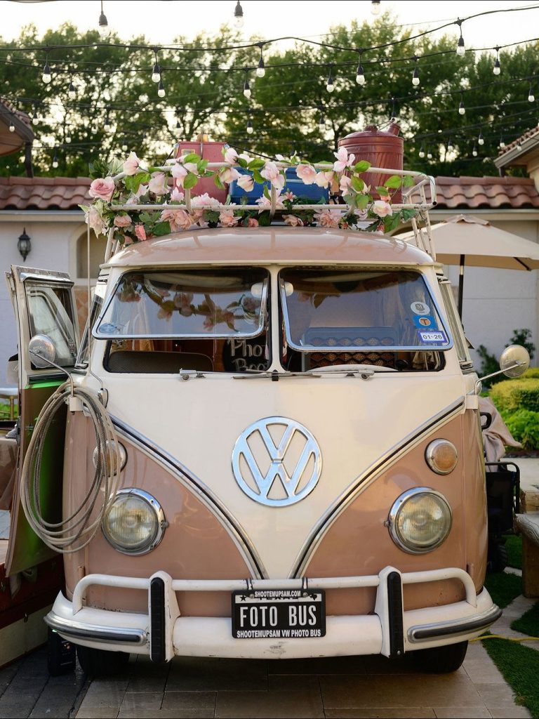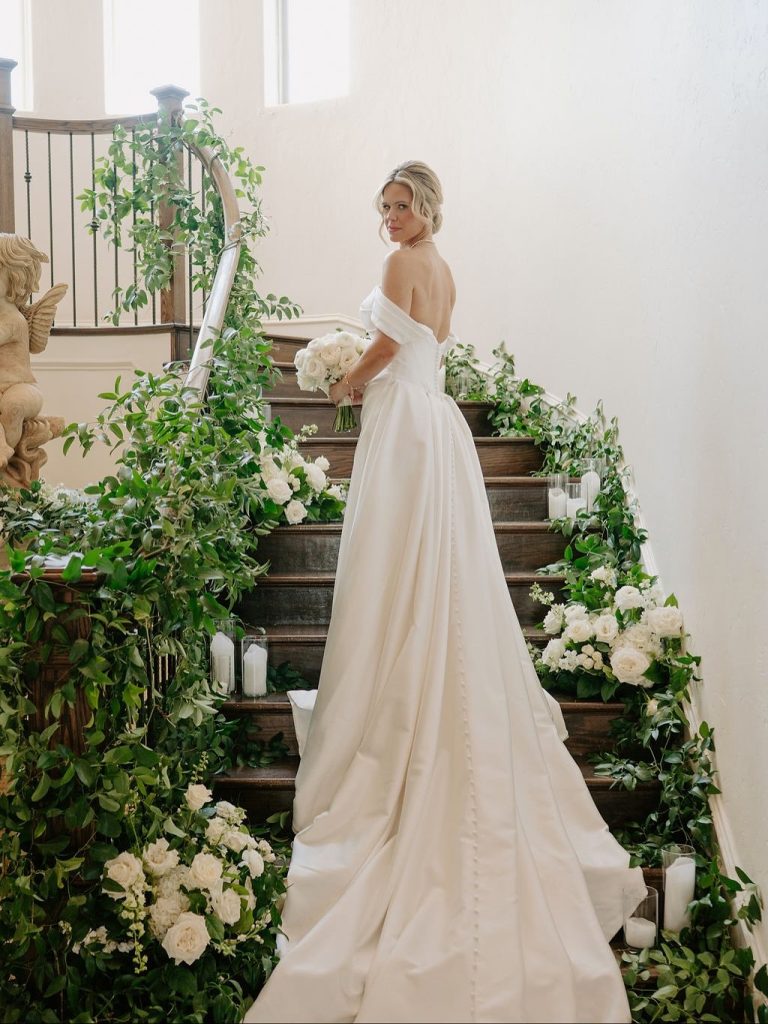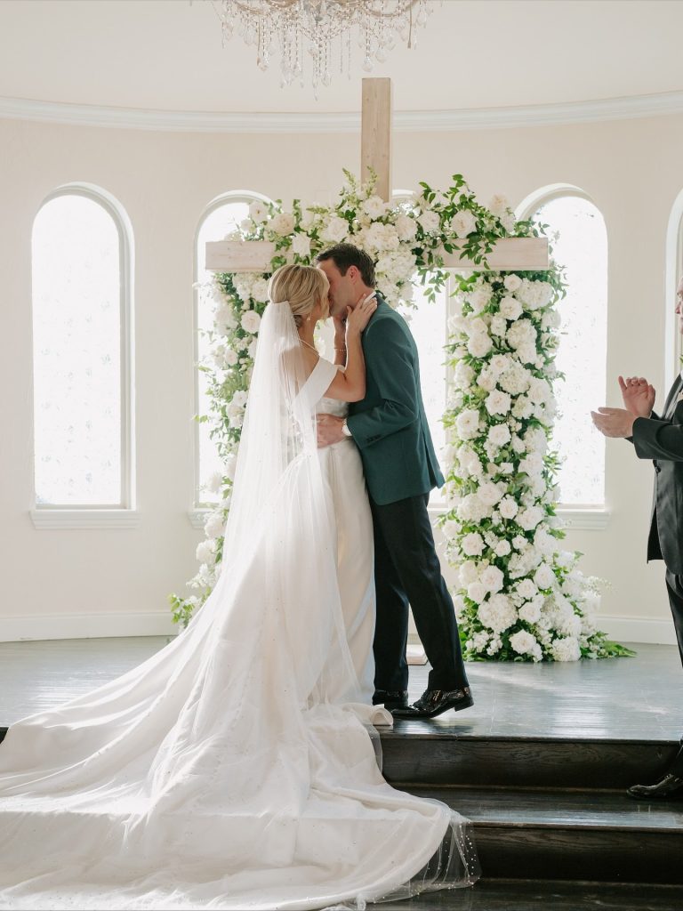 This Texas wedding brought romantic garden style to life with lush white blooms, cascading greenery, and refined gold accents. The couple shared “I do” beneath a flower-covered altar before celebrating among candlelit tables layered with elegant textures. From the bride’s classic gown to the groom’s rich green tux, every detail felt elevated yet personal. A vintage photo bus and heartfelt touches added personality and charm, making the day as joyful as it was beautiful.