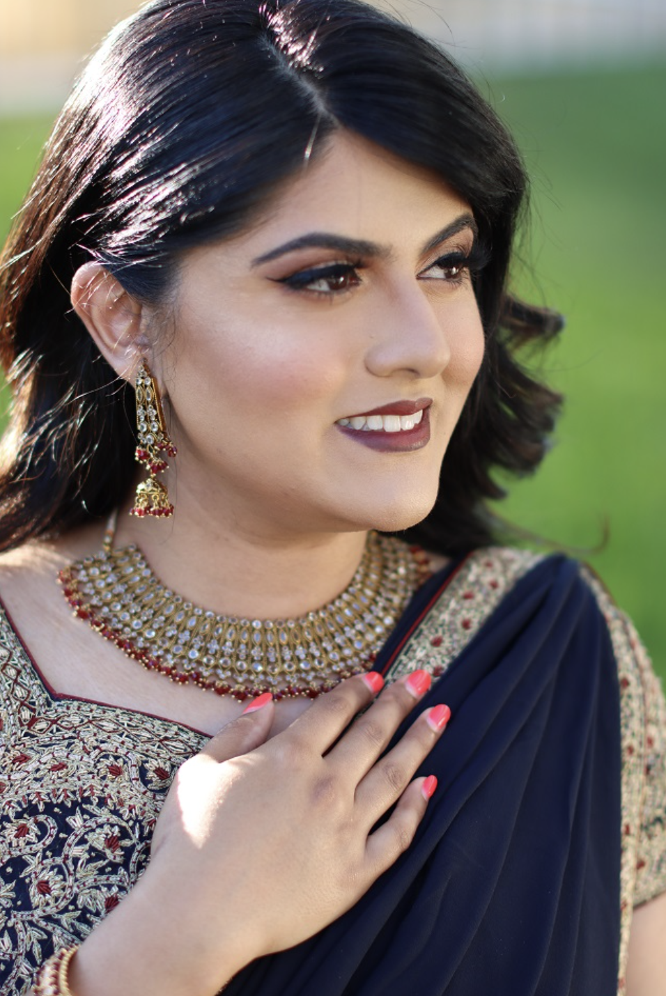 With the model’s skin tone, striking black hair and beautifully full lips, I decided to keep the look simple and streamlined and kept the focus on her lips. Eyes are softly defined with a wash of gold and champagne shimmer, black liner and dense faux mink lashes, while the cheeks have a light coral flush and lips have a really lush appearance, achieved by layering several different shades of crimson.