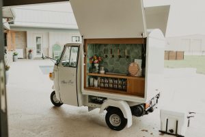 A mobile bar cart is a stylish, transportable bar setup that can be brought to virtually any venue, indoors or outdoors. Allora Mae Mobile Bar elevates the experience with their signature Italian Piaggio Ape, serving everything from handcrafted cocktails and curated mocktails to wine, beer, and custom drink menus designed just for your celebration.