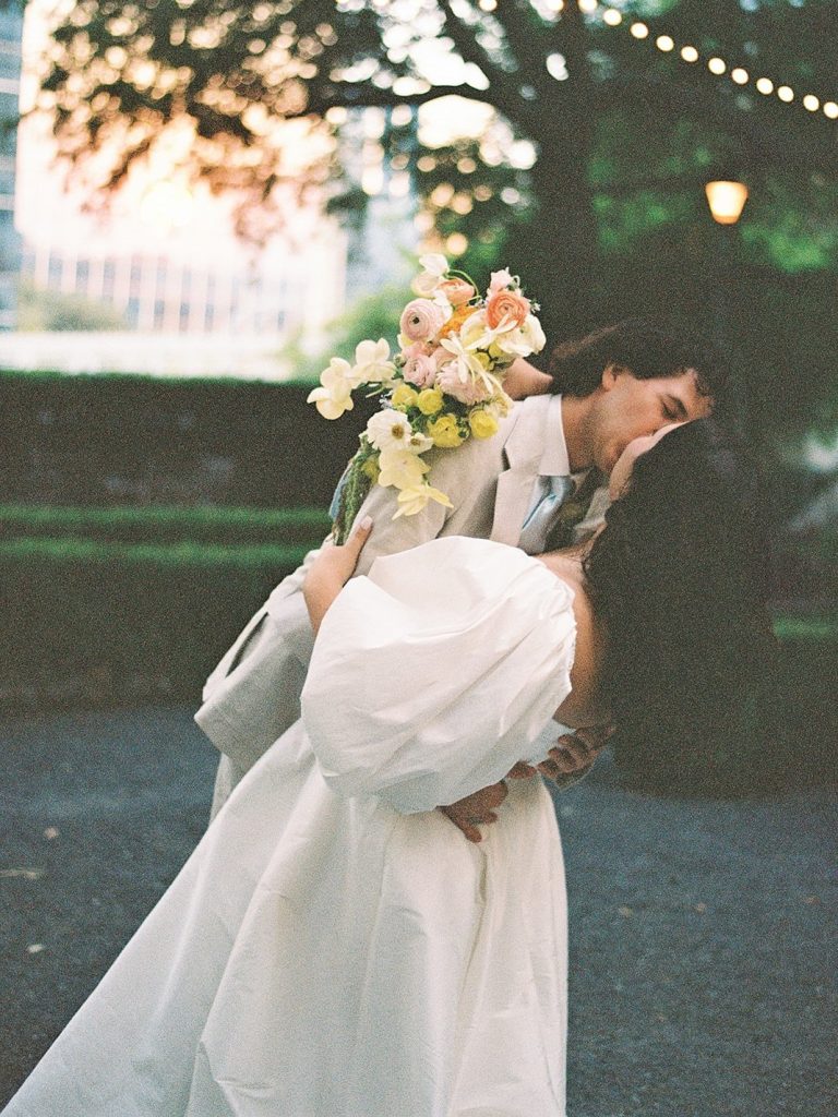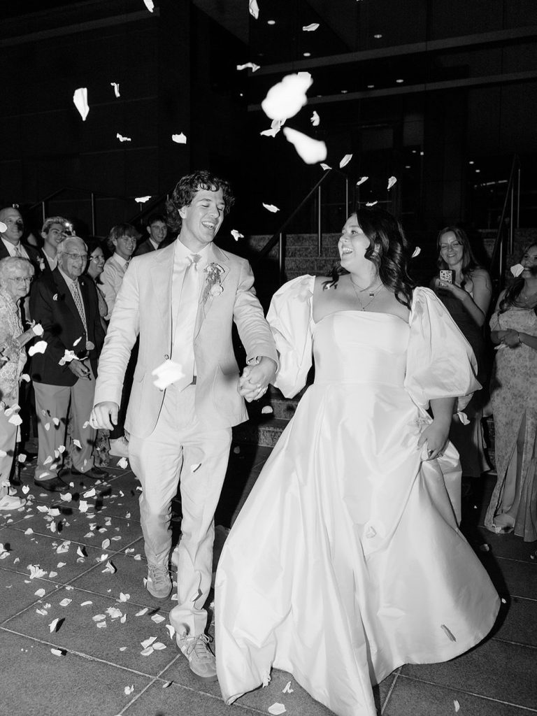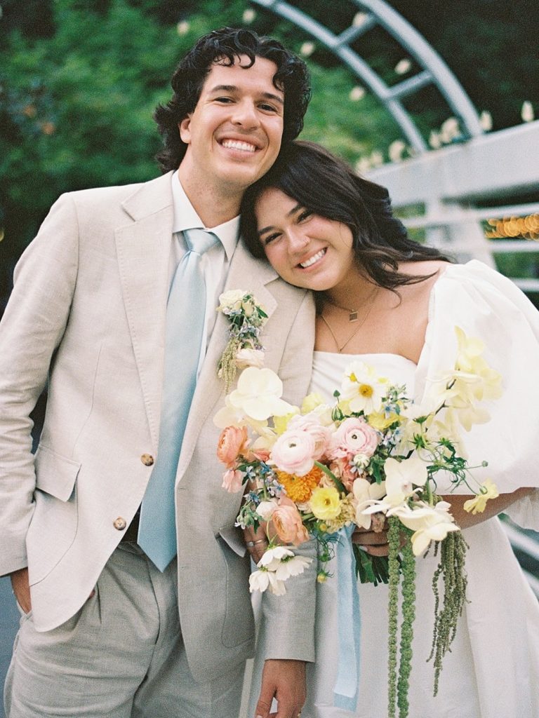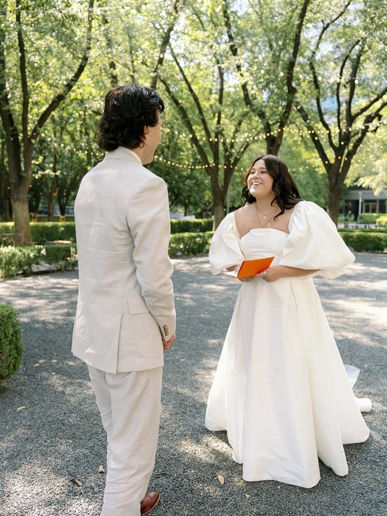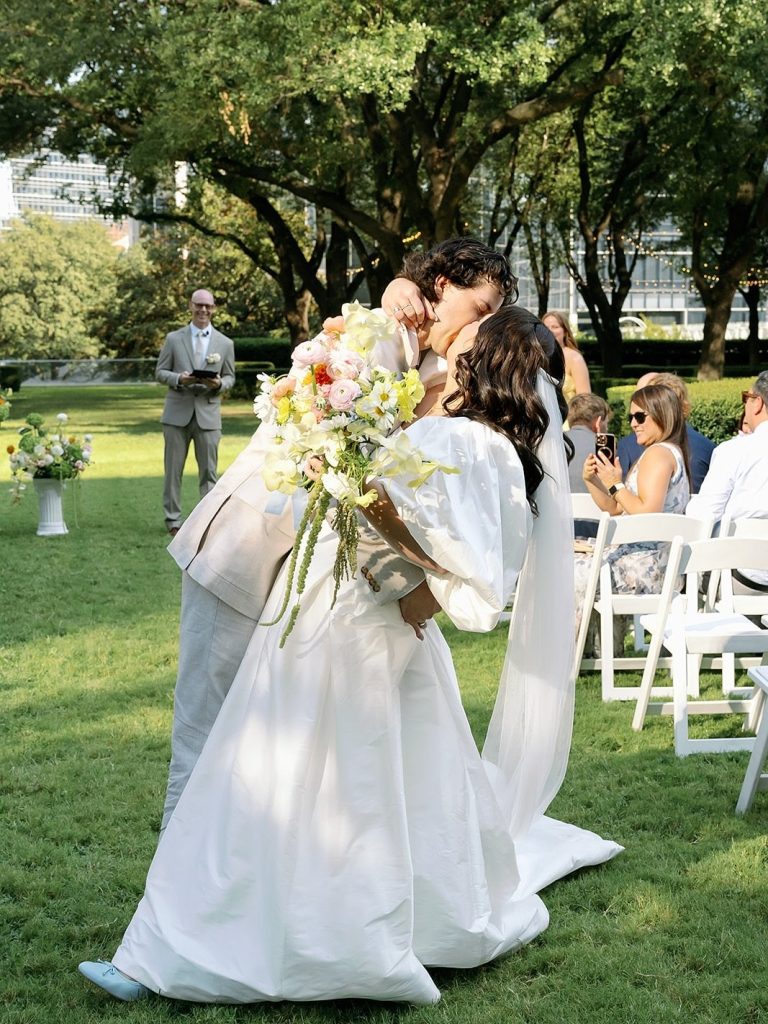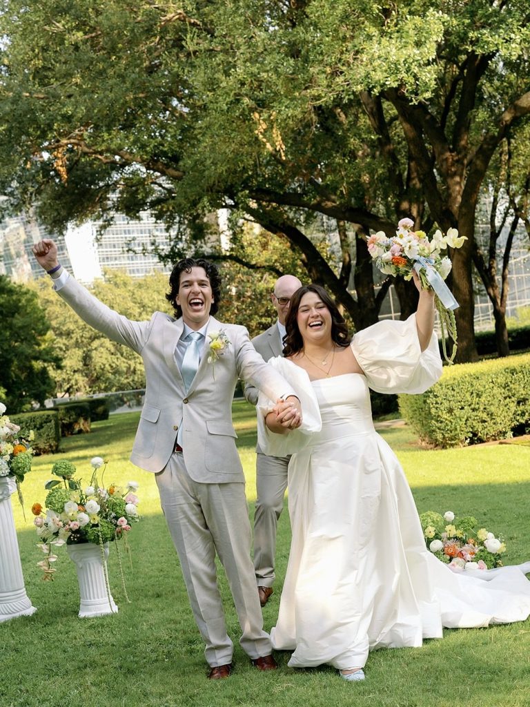 Filled with cheerful color and heartfelt moments, Ruthy and Aidan’s garden wedding at Marie Gabrielle in Dallas perfectly captured their playful, modern style. The couple exchanged vows surrounded by blooming florals in shades of yellow, peach, and ivory before celebrating under the trees with family and friends. Every detail—from the joyful paper suite to Ruthy’s puff-sleeve gown—reflected a day full of personality, love, and lighthearted charm.