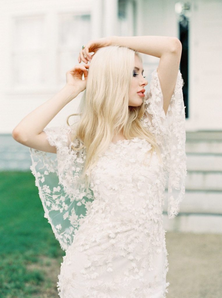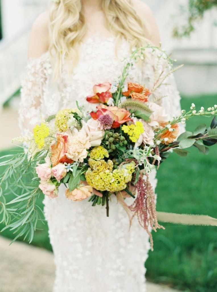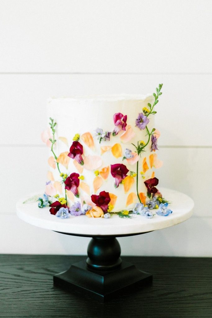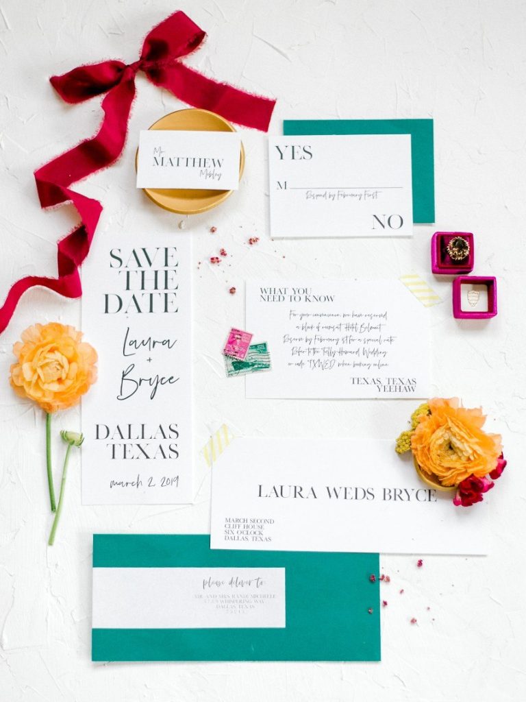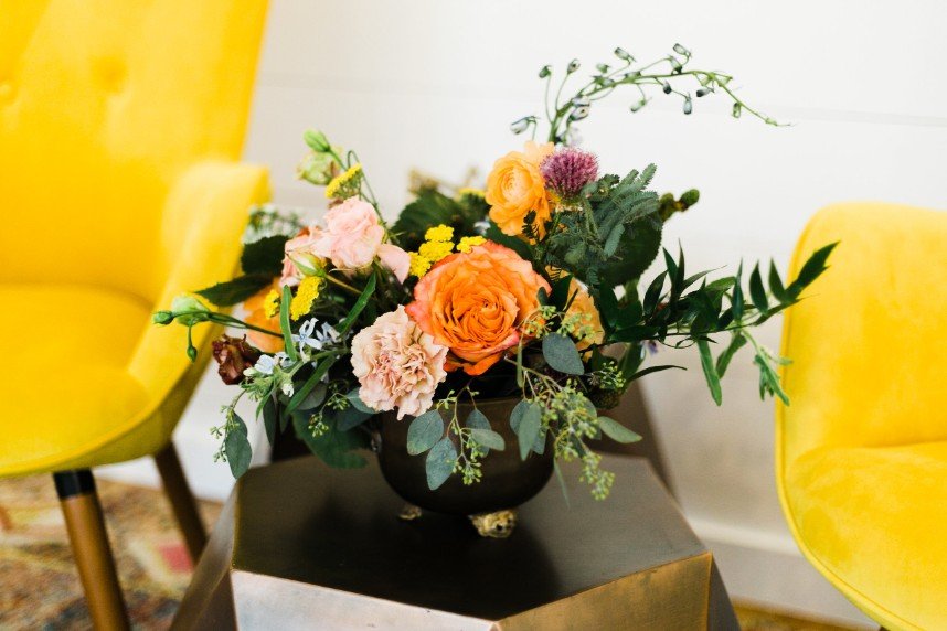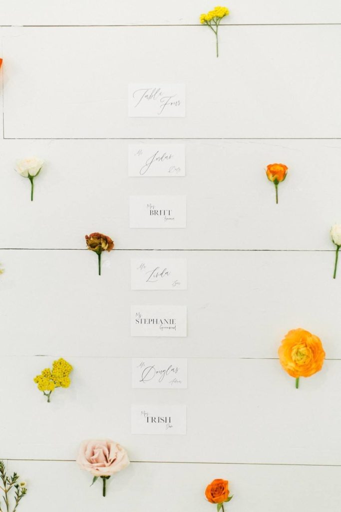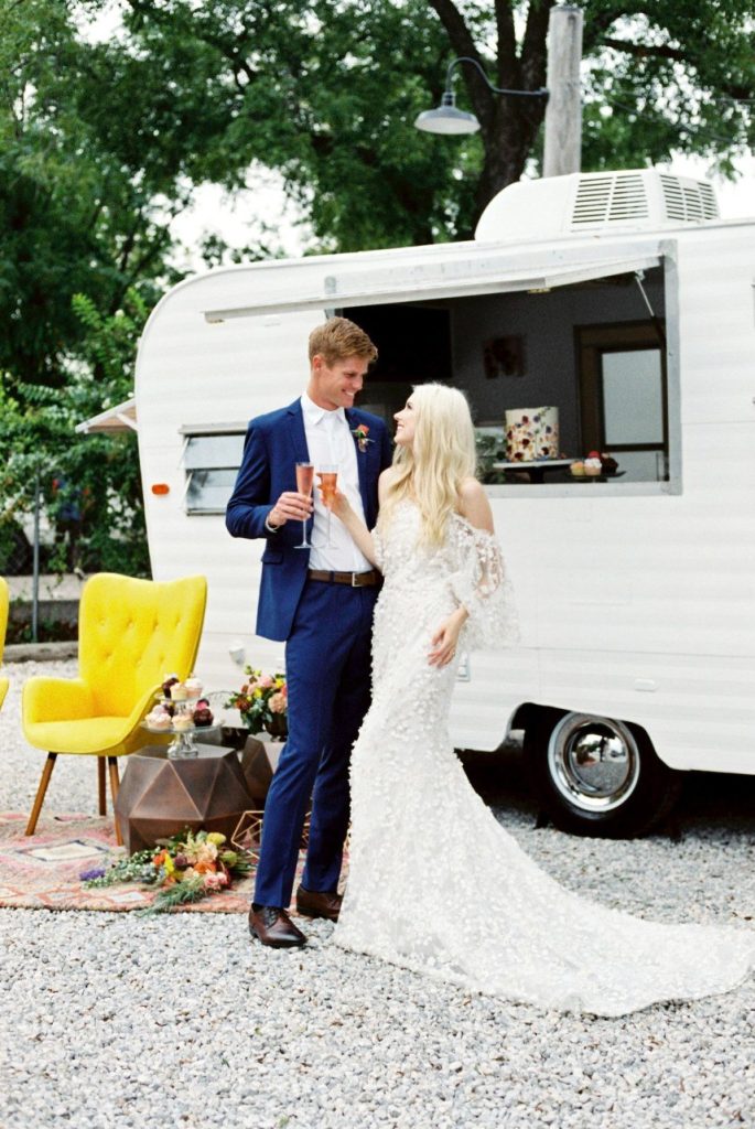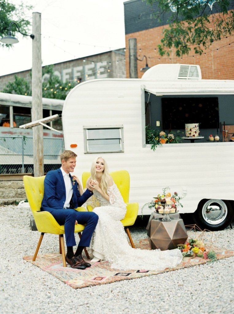 From The Cliff House‘s darling intimate space in south Dallas comes this whimsical mid-century modern wedding inspiration, with so many funky, eye-catching details we just adore! This scene has the perfect mix of bright, cheery colors, like yellow chairs from Coral Lane and an organic, colorful bouquet from Kate McLeod Studio, along with a few dark and moody elements for contrast – mercury glass and candlesticks give the tabletop a boho, vintage vibe. We’re obsessed with the way the loose, fresh florals mimic the pattern on the bride’s gown from Lovely Bride Dallas. From the flowers on the cake, to the darling floral wall holding the place cards, the theme is carried out perfectly! Carrying the whimsical mid-century modern aesthetic beyond the venue’s walls is an intimate lounge setup inviting guests to the vintage airstream outside – such a fun touch! Captured beautifully by Brittany Clark Photography, this wedding inspiration gives us fun ideas perfect for couples who like to think outside the box and embrace a unique style. Cheers!