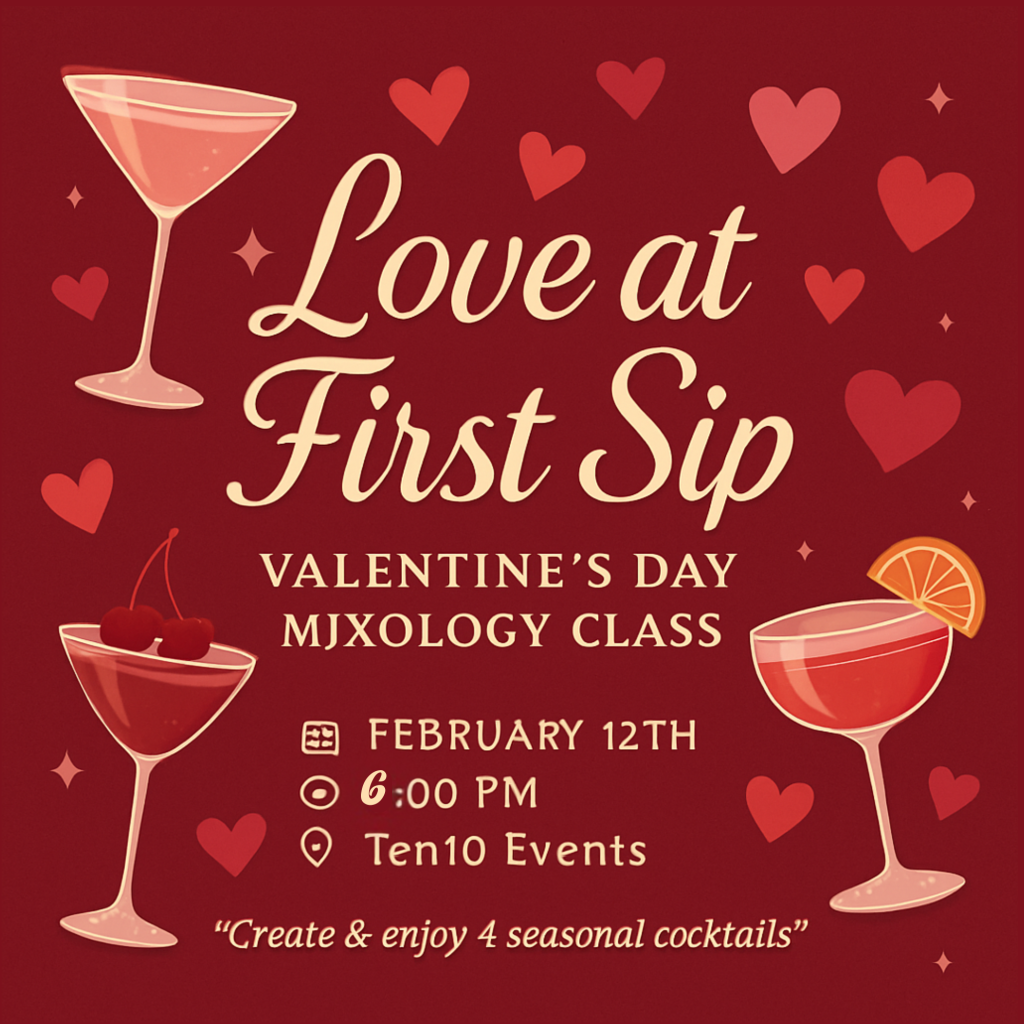 Love at First Sip is the perfect way to kick off Valentine’s week. Join us for an interactive mixology class where you’ll learn to create four seasonal cocktails while enjoying lite bites, a raffle entry, and a relaxed, romantic atmosphere. Whether you’re coming with a date, friends, or flying solo, this experience is all about great drinks, good vibes, and unforgettable pours. Free parking included.