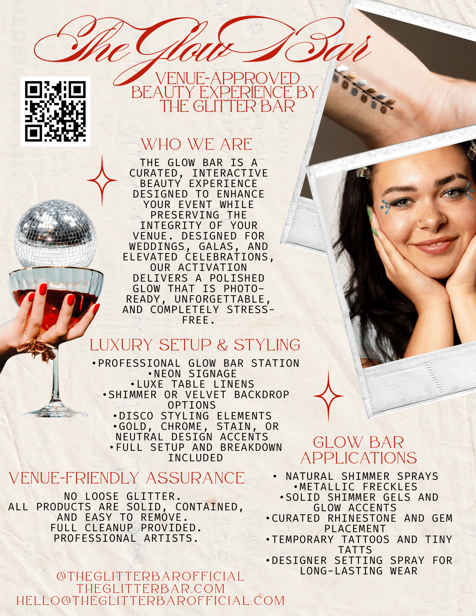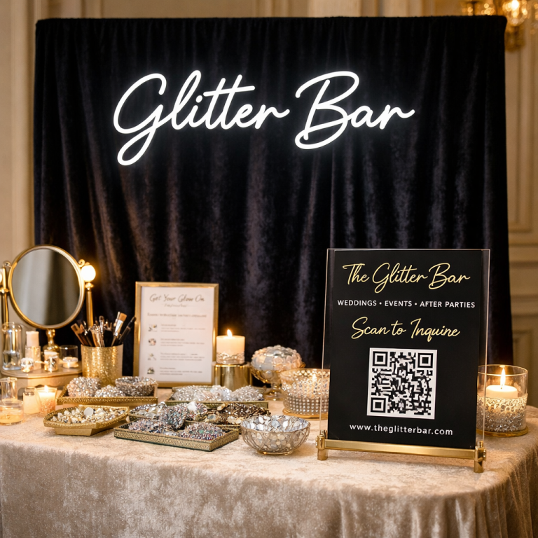 Luxury Pop-Up Glam Experiences for Every Celebration.Bring sparkle, style, and unforgettable fun to your next event. The Glitter Bar transforms any celebration into a high-end, interactive glam moment — complete with custom décor, professional artists, and photo-ready looks that dazzle.