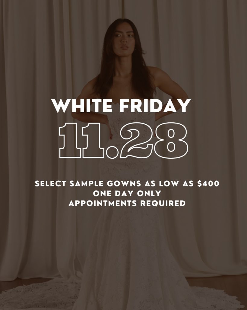 Don’t miss our exclusive Sample Sale! Shop a beautiful selection of sample gowns offered at deeply discounted prices — perfect for brides ready to purchase off the rack and take their dream dress home the same day....